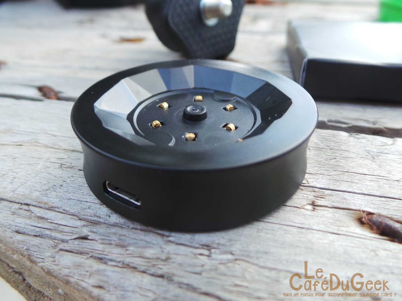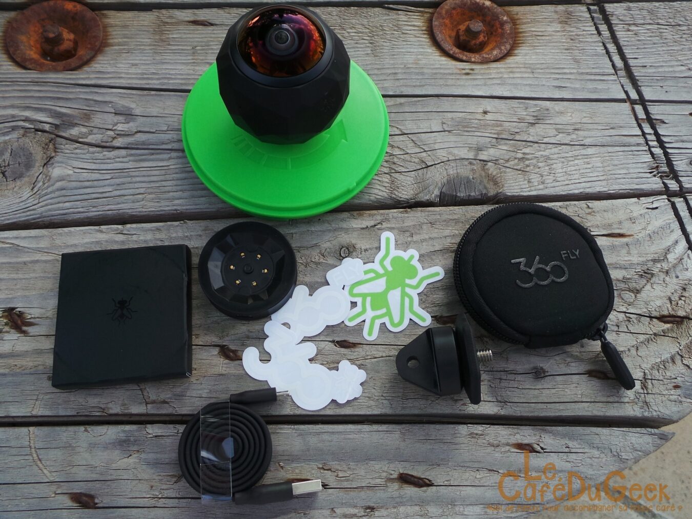 Commençons par une chose essentielle lorsque l’on achète une caméra plus ou moins sportive, les fixations fournies avec. Et là est le plus gros point noir de cette caméra. En effet, seul un adaptateur pour fixations GoPro est présent dans le pack. Autant dire que si vous n’avez pas de GoPro à la maison, c’est une dépense en plus à rajouter au budget déjà élevé de cette 360Fly. Hormis les fixations, une housse de transport pour la caméra ainsi que le support de chargement sont fournis. À noter que le support de chargement est très bien pensé et sait se faire discret sur un bureau. Une notice d’utilisation est bien sûr fournie avec, en cadeau, 3 stickers à l’effigie de la marque.