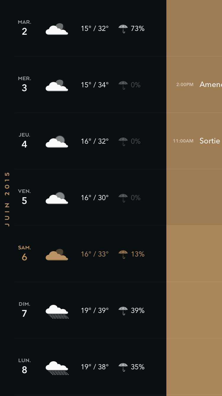 Admettons que vous désirez sortir prendre l’air dans la semaine mais vous ne savez pas quel jour sera l’occasion pour vous de vous oxygéner. TimePage vous donne un aperçu de cette semaine en glissant votre doigt vers la droite avec les températures minimales et maximales ainsi que le risque de pluie. Il est même possible de suivre les conditions météorologiques minute par minute.