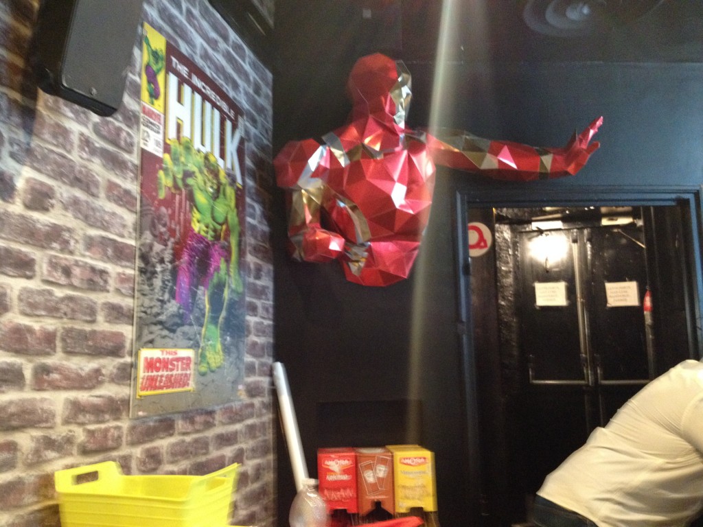 Côté ambiance et décoration, celle-ci se veut à la fois sobre et efficace avec des tableaux disposés par-ci par-là, un Iron Man au plafond et une table laissant en libre-accès des comics.