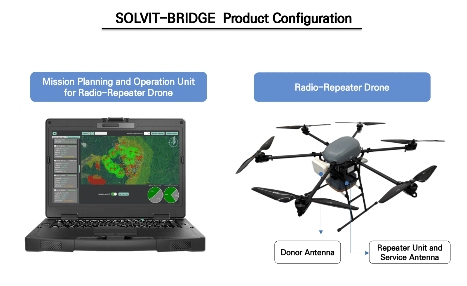 Face à cette impasse technologique, Solvit a imaginé une autre approche : amener le réseau jusqu’à la victime, au lieu d’attendre qu’elle émette un signal. C’est l’idée derrière Solvit Bridge, un drone qui agit comme un relais mobile. En survolant les zones sans couverture, il projette un signal cellulaire depuis la dernière antenne accessible.