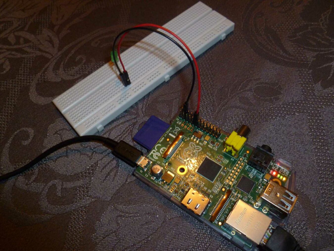 Je vais utiliser ici une breadboard pour pouvoir facilement brancher la LED. Si vous comptez continuer dans cette direction vous aussi je vous conseille d’en faire l’acquisition, ça ne coûte rien et c’est très pratique pour vous éviter les soudures ou les enroulages de câbles douteux.