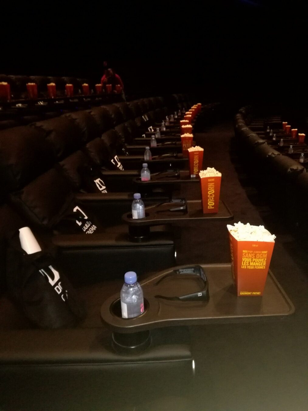 Nous retrouvons donc des sièges vraiment surprenants. En effet les sièges sont plutôt des fauteuils, qui plus est de relaxation. En plus de leur matière simili cuir, deux boutons permettent d’avoir une position assise ou semi-allongée. Par contre, je déconseille aux personnes de petite taille de trop s’incliner sinon l’expérience sera gâchée ou votre cou abîmé. Enfin le socle pour boisson, et la tablette pour poser son téléphone, ses pop-corn est utile. Plus besoin de caler vos denrées et boissons entre vos jambes où elles se réchaufferont ou tomberont à chaque sursaut.