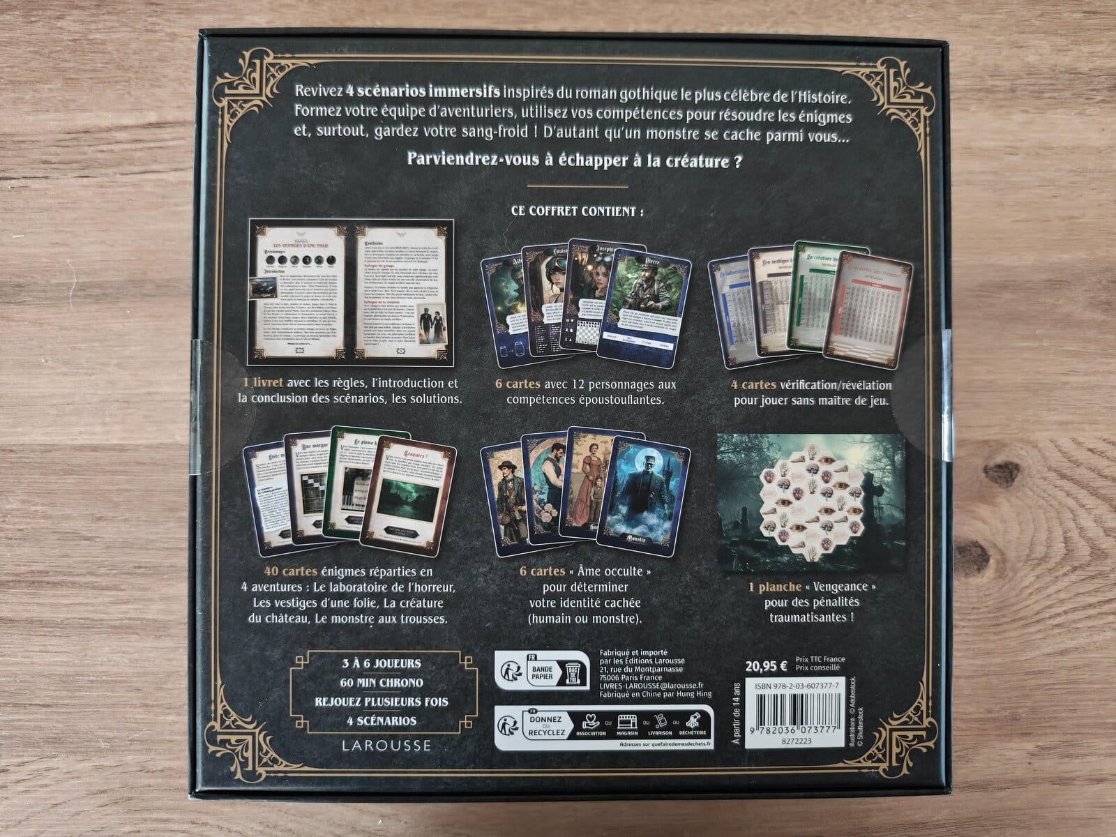 On change de registre, mais on garde l’esprit détente et immersion. « Dans l’ombre de Frankenstein » se présente comme un coffret jeu thématique, avec une proposition narrative qui invite à se plonger dans une ambiance gothique et mystérieuse. C’est le format parfait pour une soirée différente, sans écran, à partager entre amis. On y apprécie la dimension d’enquête, les mécaniques simples à expliquer, et l’atmosphère immédiatement lisible, qui motive même les sceptiques. On choisit une plage de deux heures, on installe le matériel, et on se laisse porter par l’histoire.