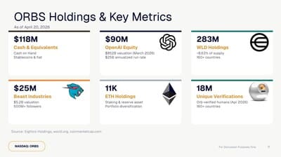 La stratégie d’Eightco est claire : miser sur la croissance des technologies émergentes. Son portefeuille se compose de 90 millions de dollars chez OpenAI, 25 millions de dollars chez Beast Industries et plus de 11 000 pièces ETH. Eightco détient également 283 millions de jetons WLD, permettant à la société d’être le plus grand acteur institutionnel dans ce domaine. Ces choix offrent une exposition unique à trois secteurs clés : l’intelligence artificielle, l’identité numérique et l’économie des créateurs.