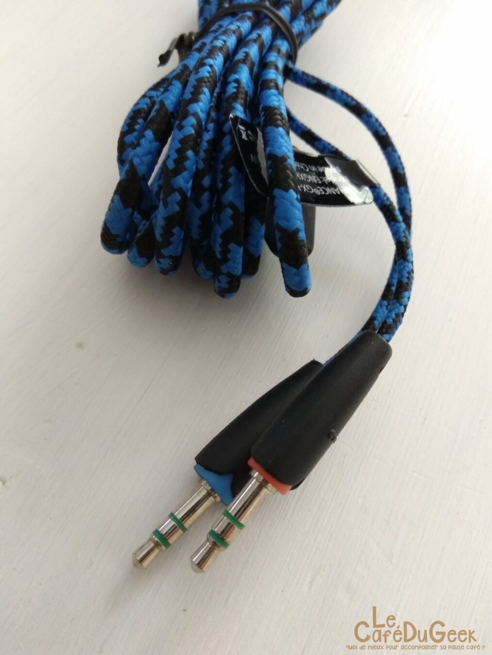- Le câble est en nylon, de couleur bleue et noire, et est ultra résistant. Il mesure 2.5 mètres.