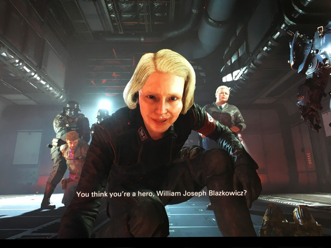 Malgré ce seul bémol, le seul décelé à la fin de plusieurs heures de démo, je suis tombé amoureux de ce jeu. L’objectif est simple, sauver le monde et plus précisément les États-Unis de l’envahisseur allemand. On retrouve les personnages phares de Wolfenstein I comme Max Hass ou Set. Mais on retrouve notre général Nazi préféré, Frau Engel. Toujours aussi déterminer a nous tuer. Connu pour sa cruauté, elle voue une haine sans borne à BJ depuis que ce dernier a détruit son visage.