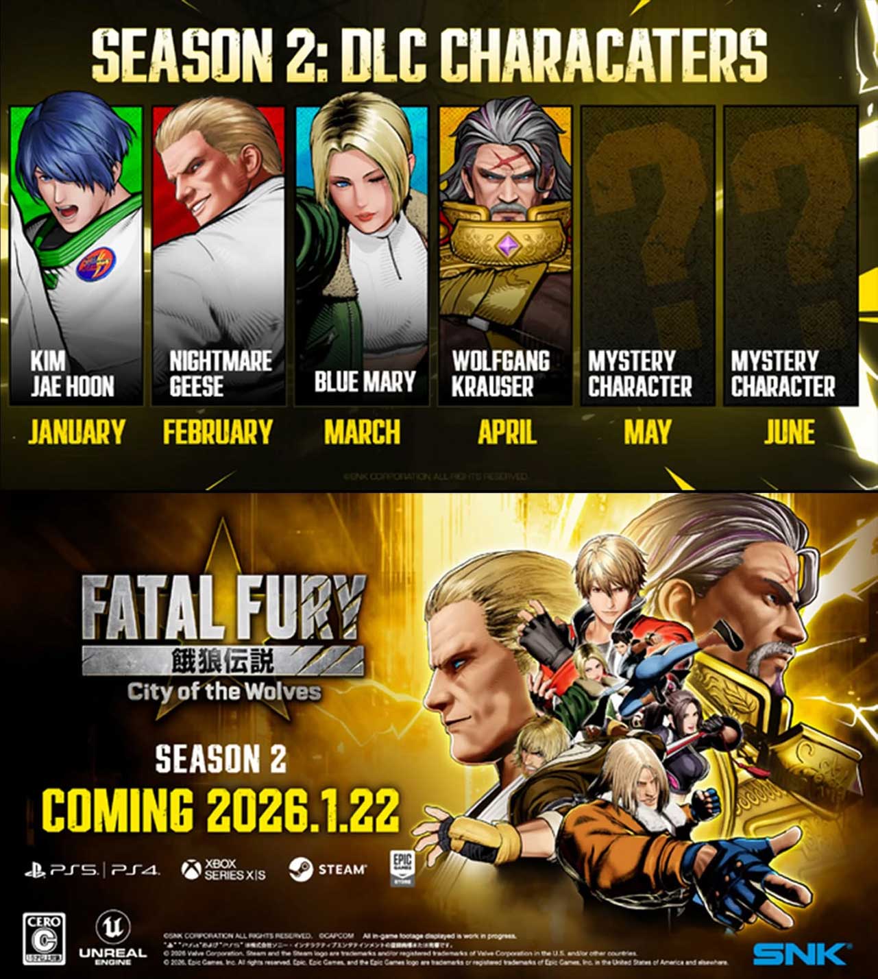 La feuille de route communiquée par SNK est claire : chaque mois, Fatal Fury: City of the Wolves accueillera un nouveau personnage jouable. La saison 2 du jeu s’ouvrira alors ce 22 janvier avec Kim Jae Hoon, avant de laisser place à Nightmare Geese en février. Blue Mary et Wolfgang Krauser occuperont les mois de mars et avril, tandis que deux combattants clôtureront la saison en mai et juin 2026. Les noms de ces deux derniers n’ont pas encore été dévoilés, mais SNK a confirmé qu’ils seraient annoncés progressivement au fil du premier semestre.