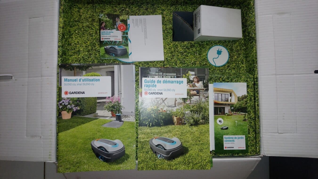 Le Sileno City Smart 500 est livré dans une boîte plutôt grosse et lourde. En plus du robot et de la borne de la station d’accueil, on trouve dans le carton le câble périphérique de 150 m, 200 crochets, une alimentation avec 10 mètres de câble et divers connecteurs. Bien sûr, un manuel complet en français est inclus. On constate que les fabricants ne sont pas avares sur le matériel pour l’installation. Par exemple, il y a plus de connecteurs de câble que nécessaire. Si un câble se casse, ou si vous voulez agrandir la pelouse plus tard, ce n’est donc pas un problème.