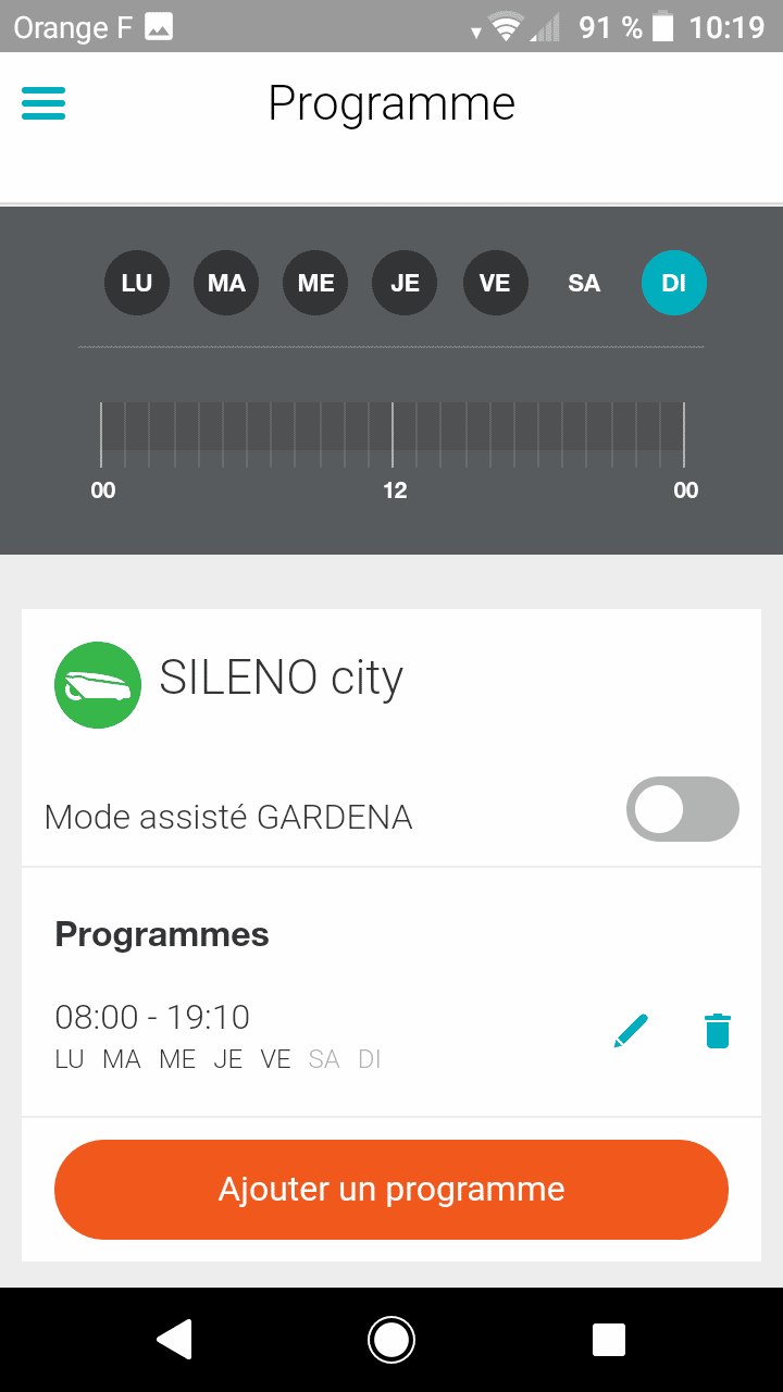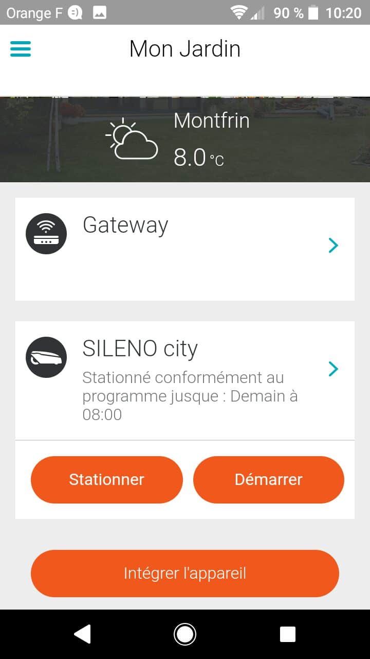 L’application Smart System de Gardena est disponible pour les smartphones iOS et Android. La configuration du boîtier et du robot sont simple du moment que l’on suit parfaitement les instructions de l’application. Par la suite on peut démarrer et arrêter le robot manuellement via l’application. Il est également possible de vérifier le niveau actuel de la batterie. Les horaires sont également programmables de manière pratique sur le smartphone. La géolocalisation, la température extérieure s’affichent aussi.
