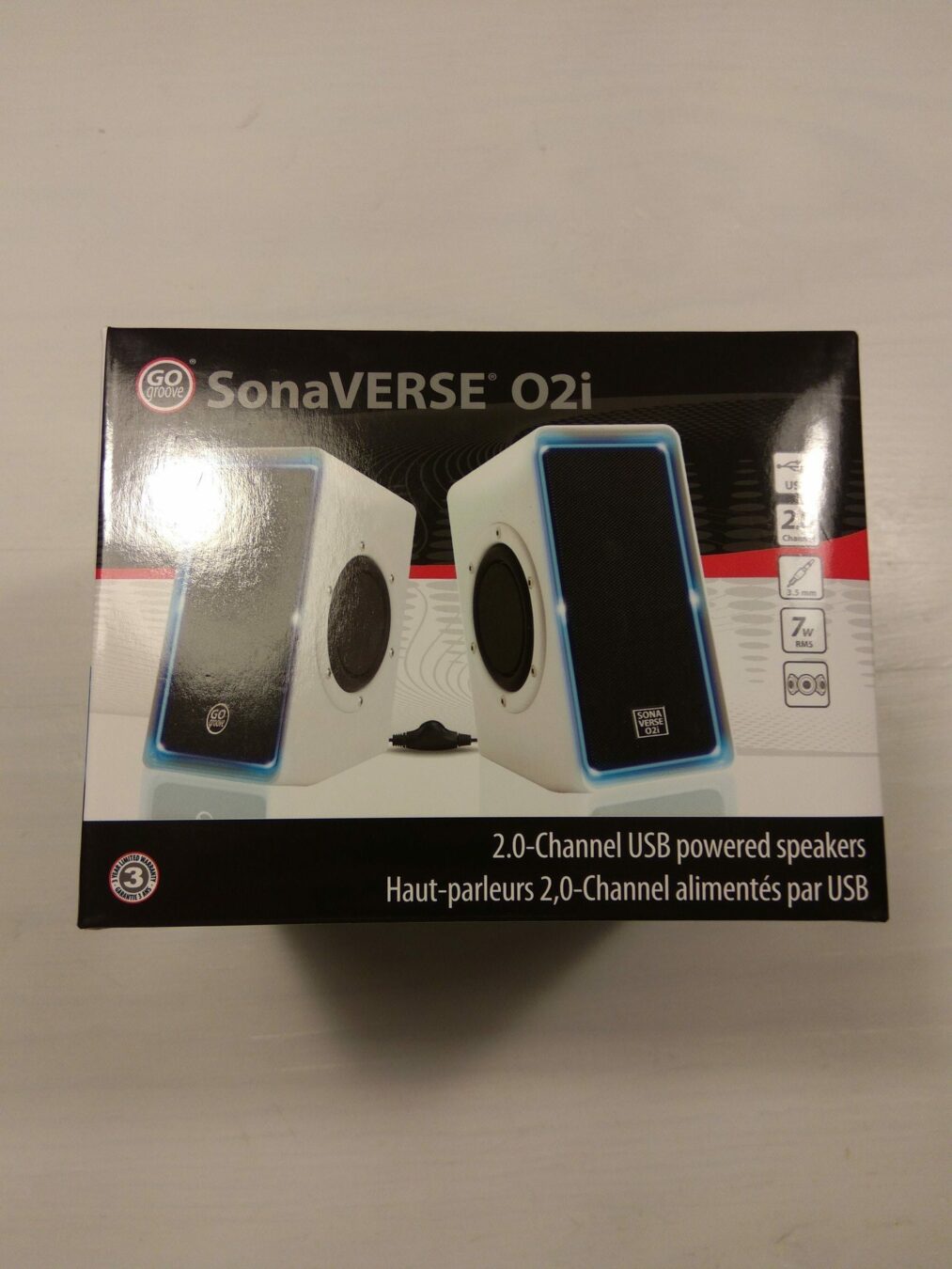 Achetées sur Amazon pour un peu moins de 40€ ( vendues par Accessory Power), je me suis laissée tenter par la version blanche et aux LEDs de couleur bleue. Reçues quelques petits jours après leur commande, les enceintes SONAVERSE O2i étaient bien emballées dans leur petit carton. Celui-ci présentait leurs caractéristiques, et toutes les petites informations à savoir sur les enceintes.