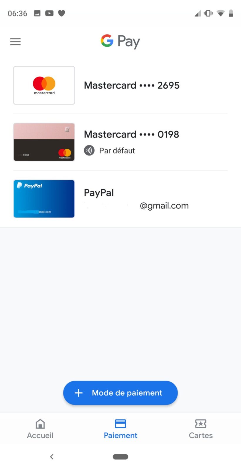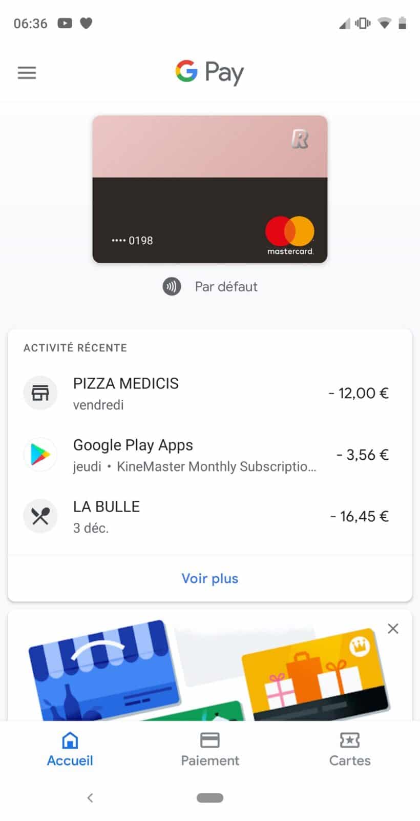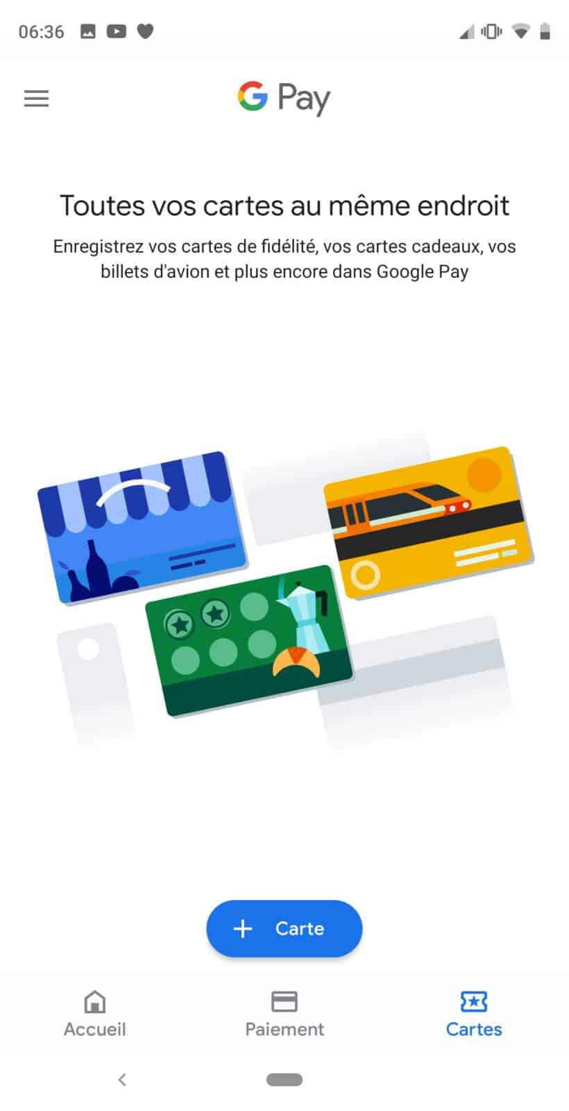 L’application Google Pay est plutôt simple à comprendre tout en étant très complète. On retrouve trois onglets en bas, le premier donnant un résumé de nos dernières transactions, ensuite la liste de nos cartes et enfin la liste de nos cartes fidélités et autre boarding pass pour l’avion.