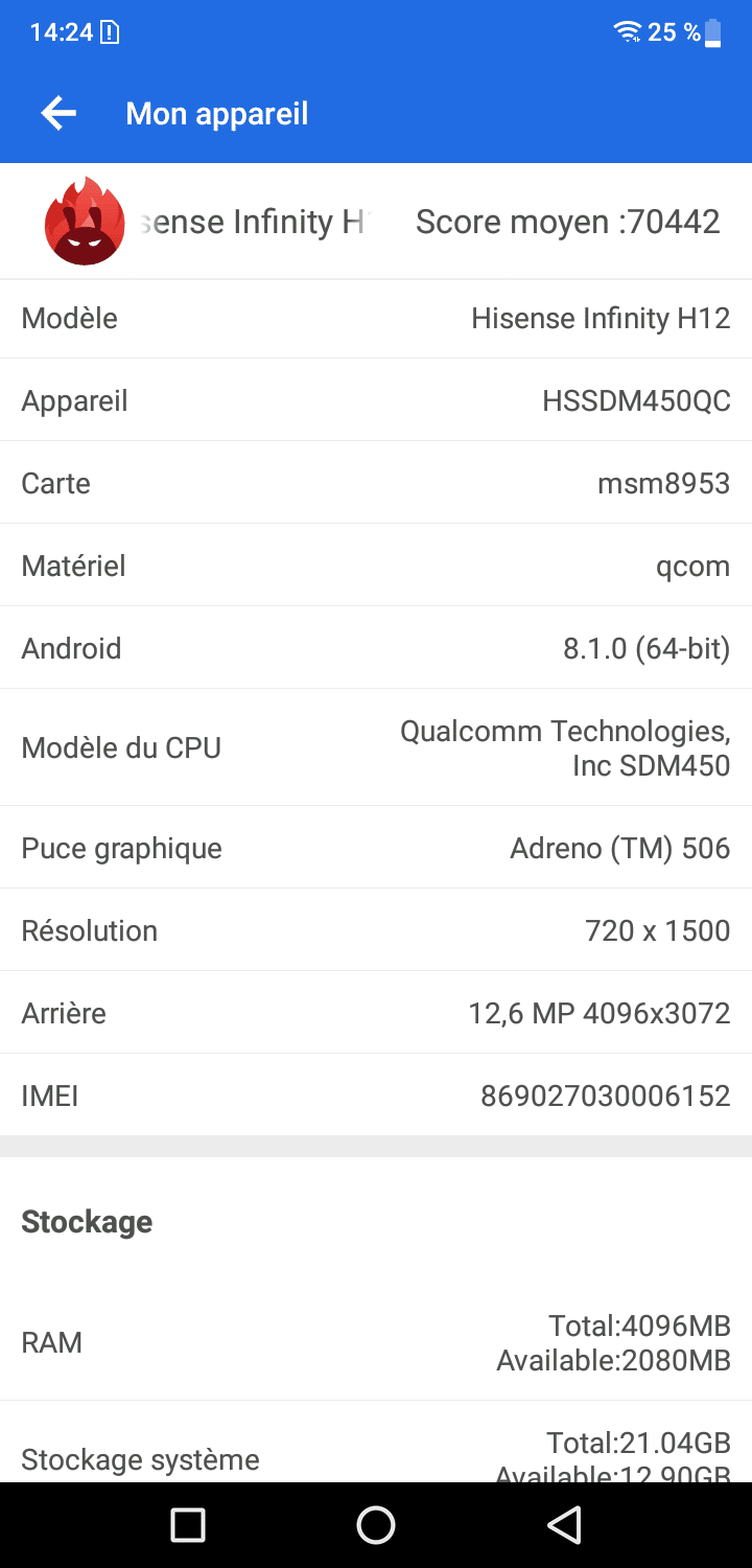 Le smartphone Hisense se situe dans le milieu de gamme, mais il demeure correctement équipé. Nous pouvons y trouver un processeur qui a fait ses preuves le Qualcomm Snapdragon 450 utilisé de nombreux appareils. Il s’agit d’un soc de 14 nm composé de huit cœurs avec une fréquence maximale de 1,8 Ghz. Il est épaulé par un GPU Qualcomm Adreno 506 et 4Go de Ram qui permettent de jouer à une multitude de jeux Android. Lors du test nous avons pu jouer à de nombreux jeux, bien entendu les titres gourmands comme PUBG, il faut tout de même ajuster le niveau de détail en conséquence selon le jeu il faut mettre moyen voir bas. L’appareil chauffe un peu, mais rien d’important à signaler.