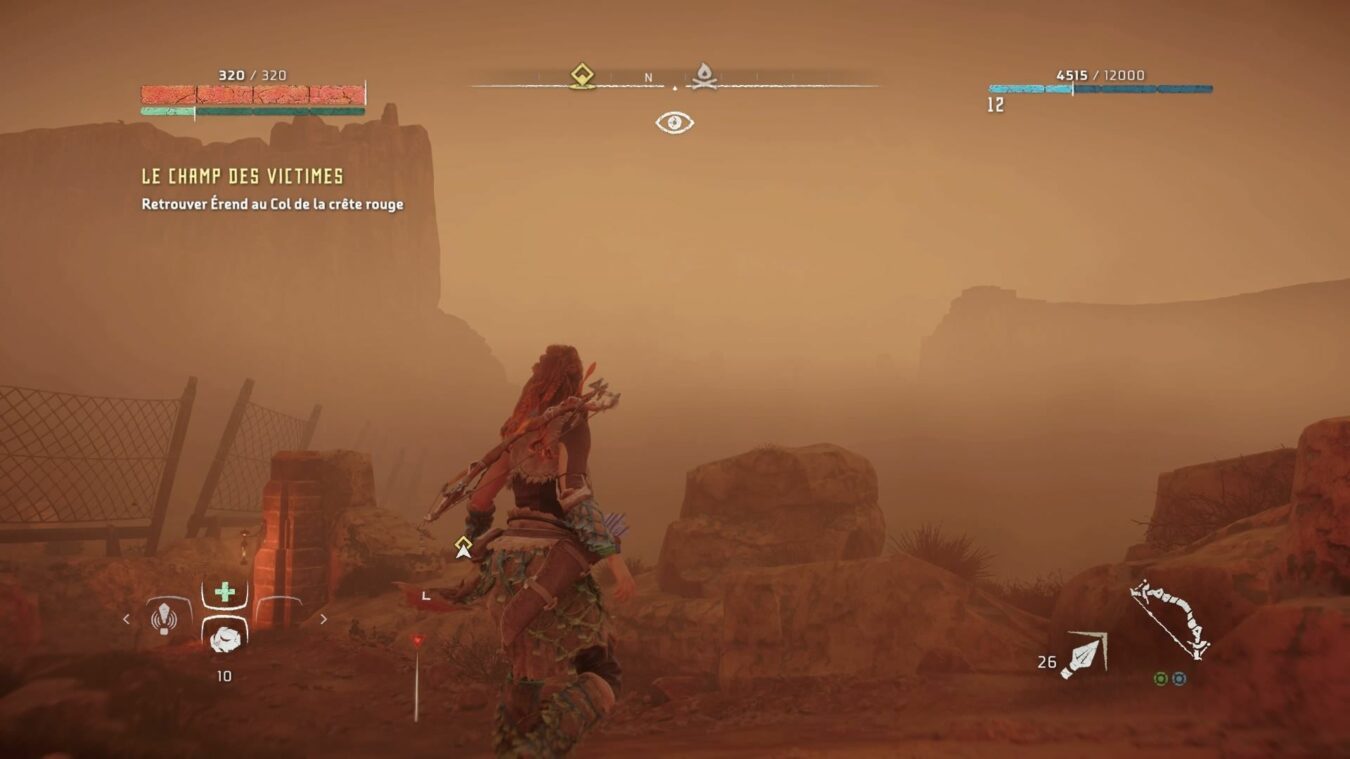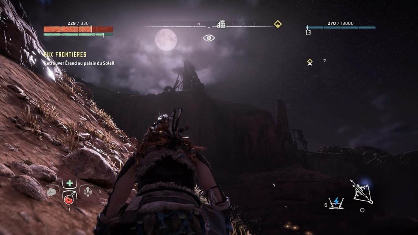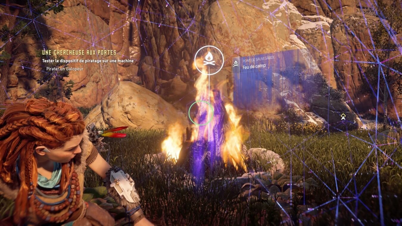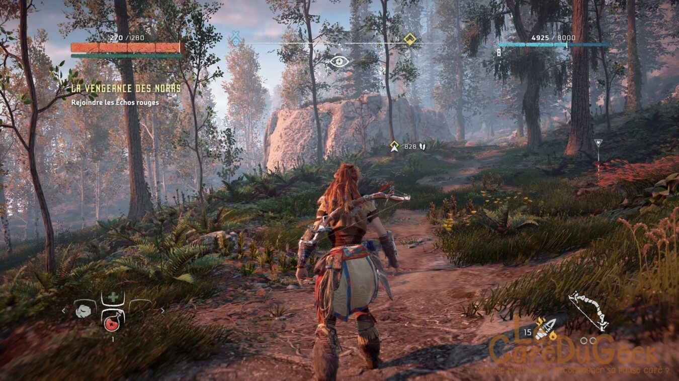 L’atout n°1 d’Aloy le focus. Une sorte d’oreillette Bluetooth qui analyse l’environnement et les ennemis. Ce dernier vous montre les points faibles des animaux, les parties sensibles apparaissent en surbrillance. Il permet également de suivre une piste laissée par un ennemis, le parcours des animaux. Bref c’est un véritable couteau suisse.