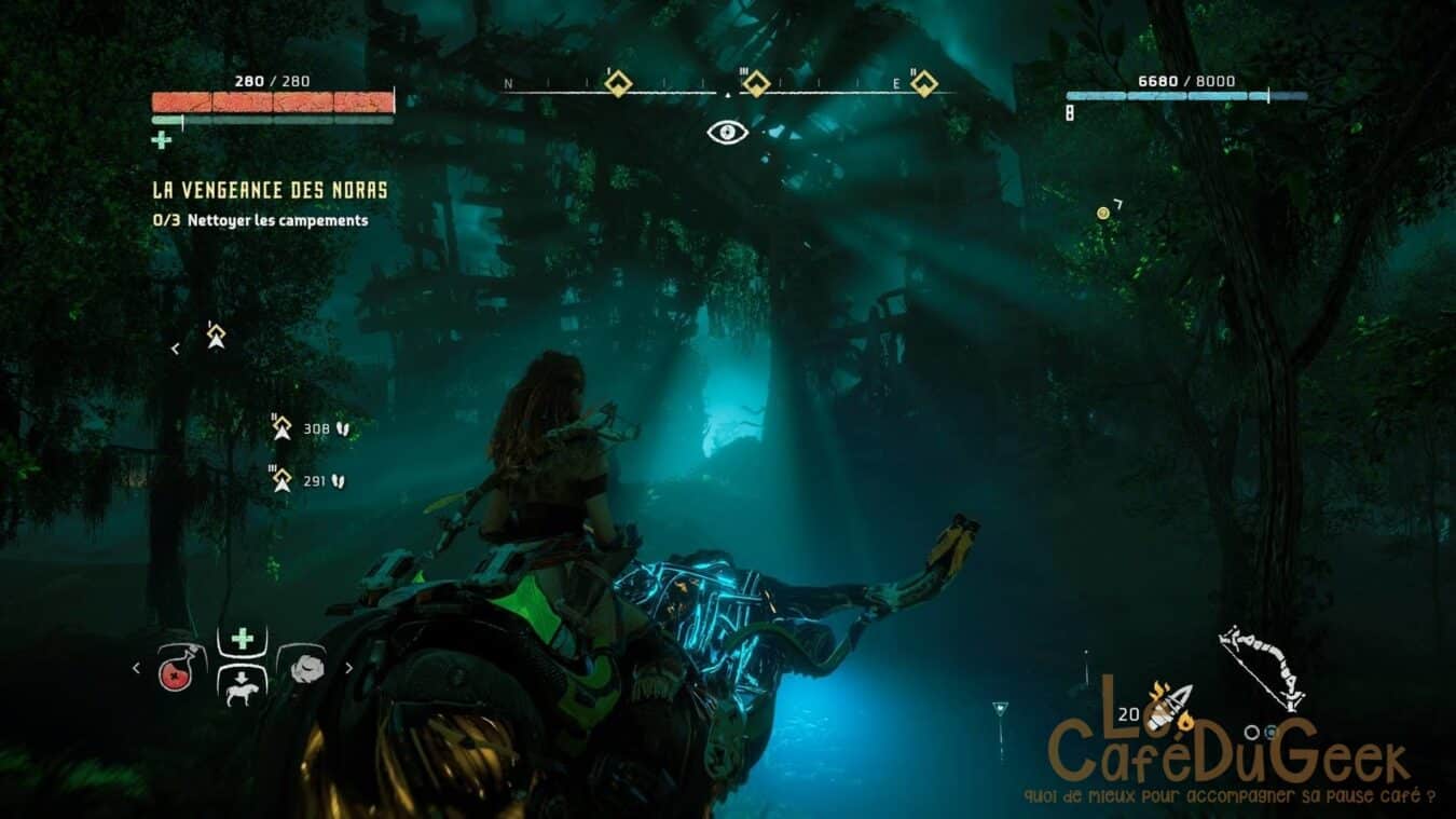 Mais comme beaucoup d’entre vous l’ont certainement déjà vu la chasse est un pilier du jeu. La variété du bestiaire ou les multiples techniques de traque. La lassitude ne s’installera pas dans votre partie. Personnellement j’ai adoré pirater les machines pour qu’elles affrontent à ma place les autres animaux ou humains. Car oui au cours de l’aventure, il n’y a pas que la faune mécanique qui est hostile. Certaines tribus en auront après vous. D’ailleurs petit bémol dans ce jeu. Autant les combats contre les animaux sont épiques autant affronté les humains est souvent plus aisé. Leur IA est des plus limitée. Vous pouvez tuer un de leur camarade, si vous vous cachez à minima, les gardes repartiront vite à la position initiale. Toutefois, pour être le plus efficace possible dans ce jeu, l’idéal est de s’appuyer sur le level design pour mieux surgir et attaquer les points faibles des ennemis. Une flèche dans la tête pour les hommes est ultra efficace. Pour les animaux, il est préférable de les scanner avant.