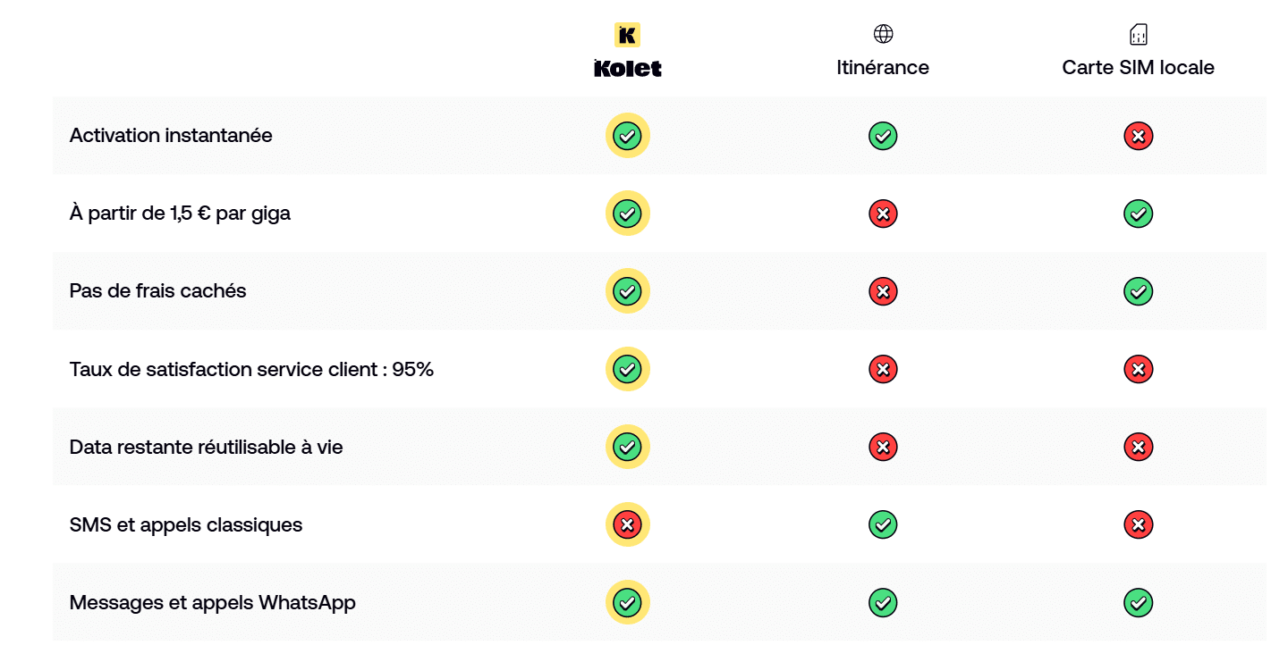 Voici un comparatif de ce que Propose Kolet et un opérateur classique en itinérance :