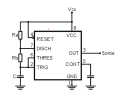 Les résistances Ra et Rb ainsi que le condensateur C permettent de modifier la fréquence d’oscillation et le rapport cylique (allez faire un tour sur le net si vous voulez savoir à quoi correspondent ces termes, ils sont assez importants au fonctionnement de ce CI).