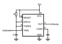 Immédiatement après l’application du front descendant, la bascule interne ainsi que la sortie sont activées. Du même coup, le transistor de décharge est désactivé permettant au condensateur C de se charger à travers la résistance R. La forme d’onde aux bornes du condensateur est celle d’un circuit de premier ordre RC face à un échelon de tension, c’est-à-dire une exponentielle croissante. Lorsque cette exponentielle atteint une valeur égale à deux tiers de la tension d’alimentation Vcc, la bascule interne est désactivée ramenant la sortie et le condensateur à zéro.