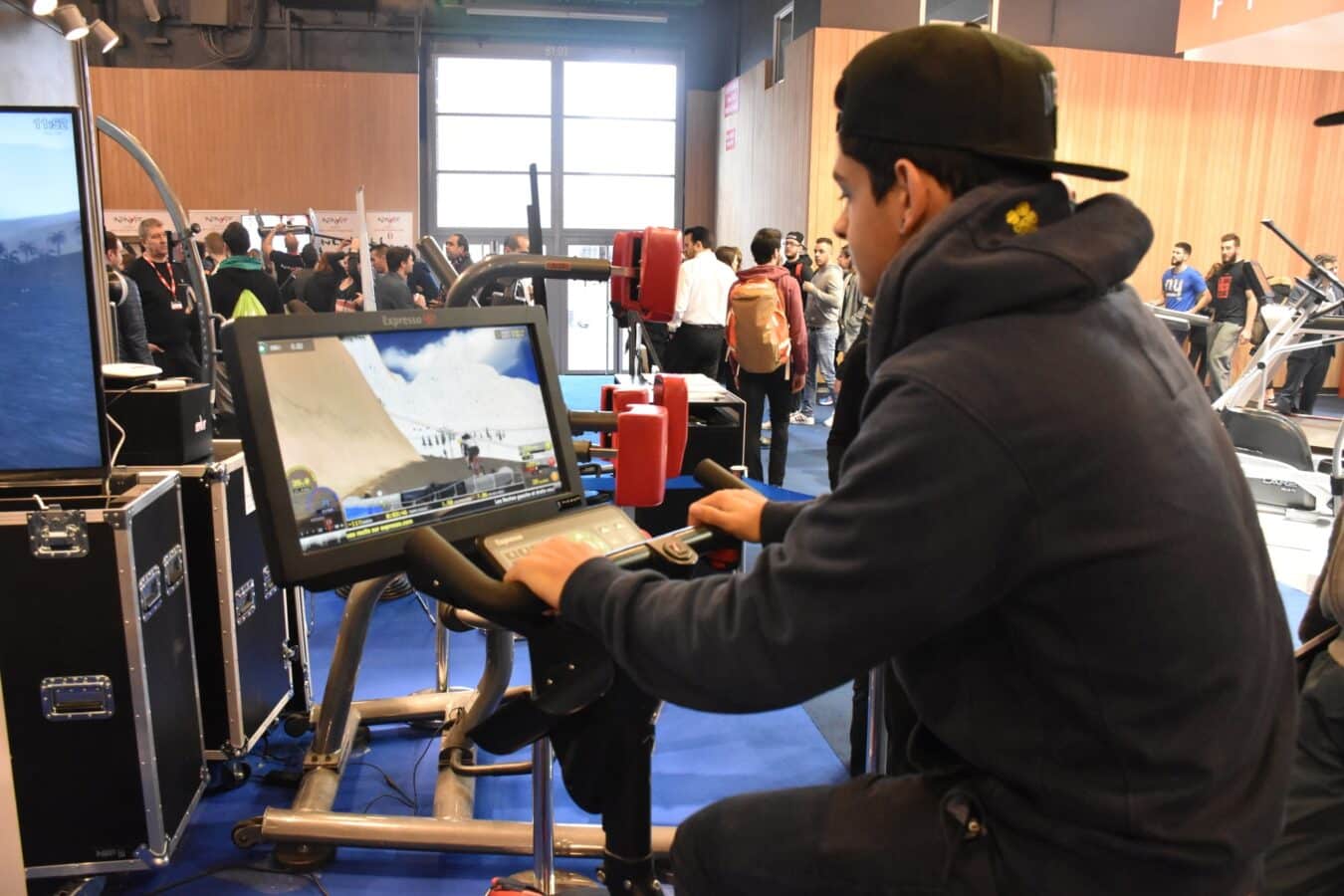 Les photos ci-dessus sont celle de deux machines ! La première est un vélo doté d’un guidon et destiné aux particuliers, vous vous déplacez dans un environnement 3D et la difficulté du pédalage évolue en fonction de l’inclinaison du terrain. Vous tournez en temps réel dans le monde virtuel, et vous pouvez suivre votre progression ! Comptez tout de même quelques milliers d’euros pour une machine de la sorte…