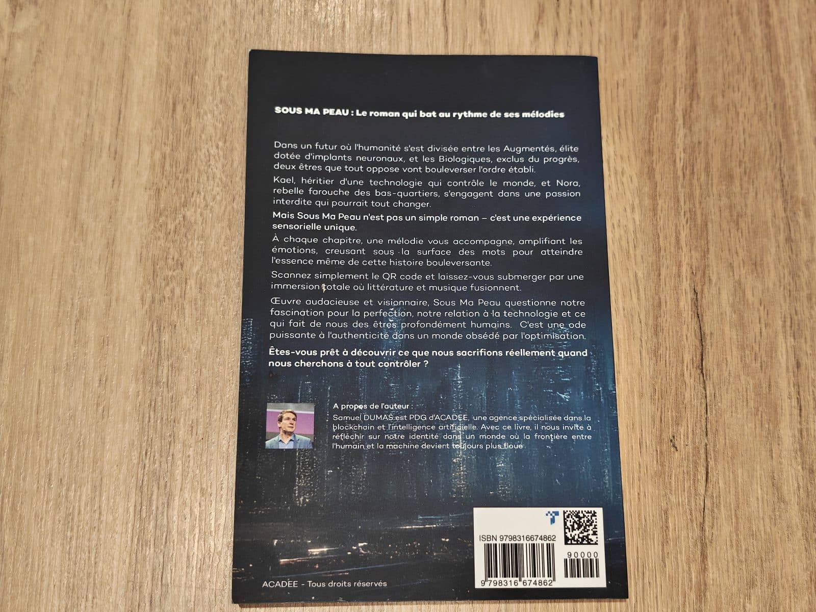 Dans un futur proche, l’humanité s’est scindée en deux. D’un côté, les Augmentés : hyperconnectés, améliorés par implants neuronaux, gouvernés par l’algorithme. De l’autre, les Biologiques : laissés-pour-compte d’un monde qui a choisi la performance au détriment du vivant. Ils n’auraient jamais dû se rencontrer. Et pourtant…Leur lien interdit devient une faille dans le système. Un vertige. Un choix impossible entre confort et vérité. Mais Sous Ma Peau n’est pas seulement un roman. C’est une expérience sensorielle augmentée. À chaque chapitre, une musique originale accompagne la lecture, amplifiant les émotions, révélant les non-dits, creusant les silences. Cette œuvre immersive questionne notre rapport à la technologie, à l’optimisation de soi, et à ce qu’il reste de profondément humain quand tout semble programmable.