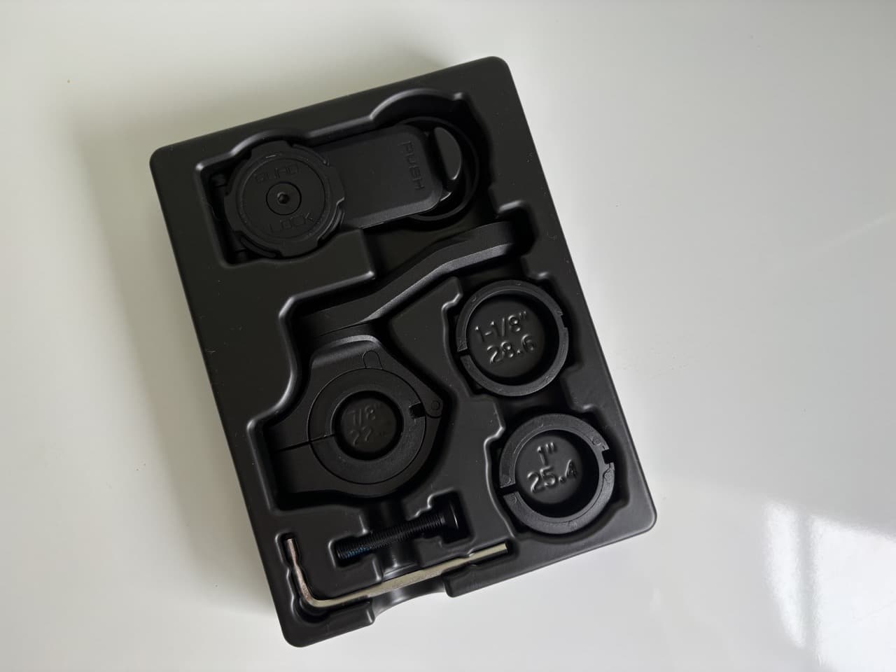 Pour accompagner ces coques MotoGP, Quad Lock propose son support guidon moto Pro. C’est un accessoire que nous connaissons déjà bien et que nous avons eu l’occasion de valider lors de précédents tests. Entièrement conçu en aluminium, il respire la solidité dès la prise en main. L’installation est simple et rapide. Le mécanisme de serrage s’adapte à de nombreux diamètres de guidon.