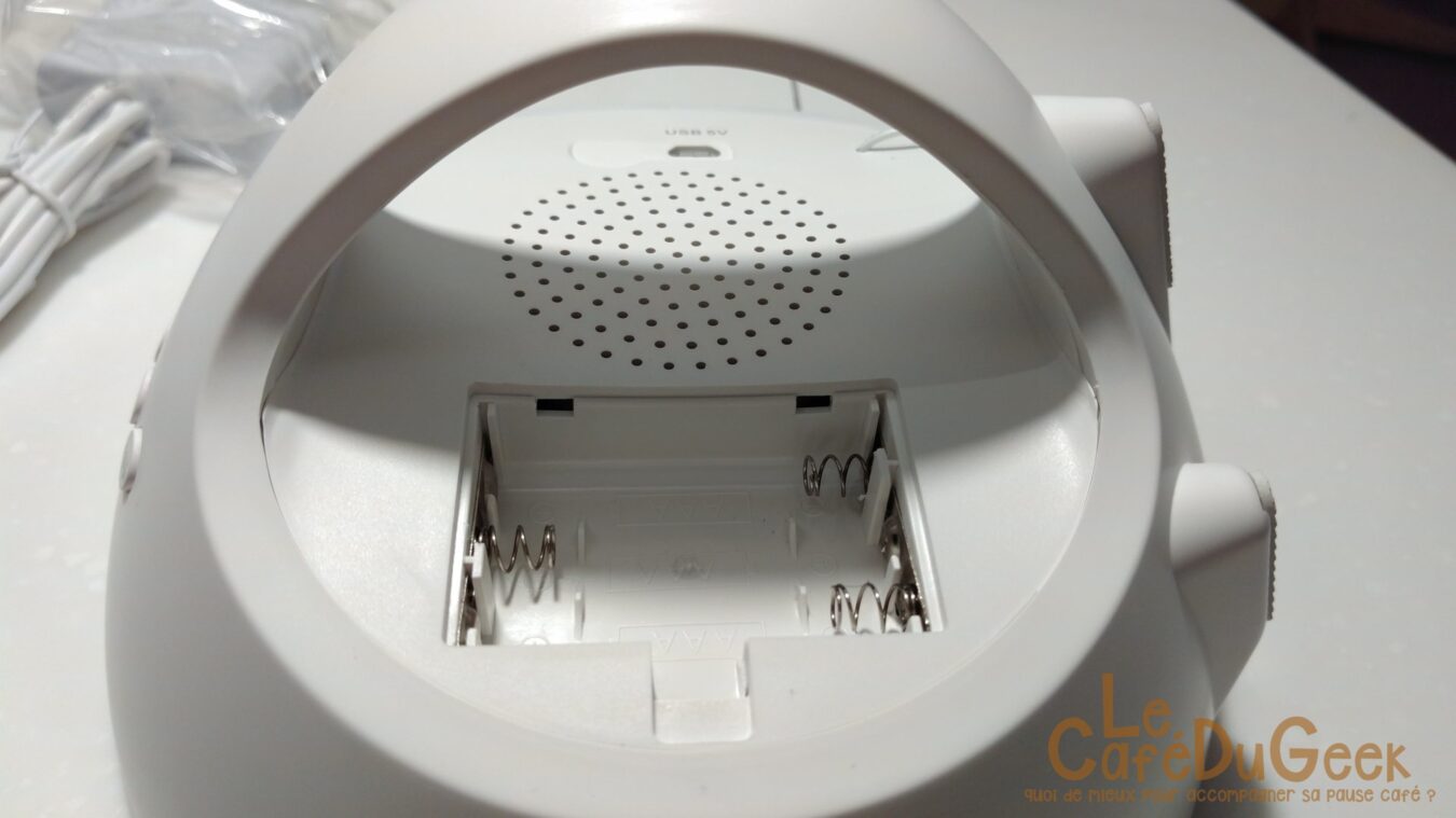 Au niveau du design, l’appareil est plutôt bien pensé. Le maintien se fait grâce à 4 petit grips situés dessous. Sur l’arrière est présent le haut parleur ainsi que la prise micro USB. A noter que le haut parleur ne délivre pas un son des plus cristallins mais ce n’est pas vraiment ce qui est demandé. Vous remarquerez aussi la possibilité offerte par Amir de mettre des piles, utile pour ne pas dépendre d’une prise électrique. Par contre, aucune piles n’est fournie avec. Le dessus révèle 4 boutons, permettant principalement de gérer toute la partie son mais également la luminosité de l’heure affichée.