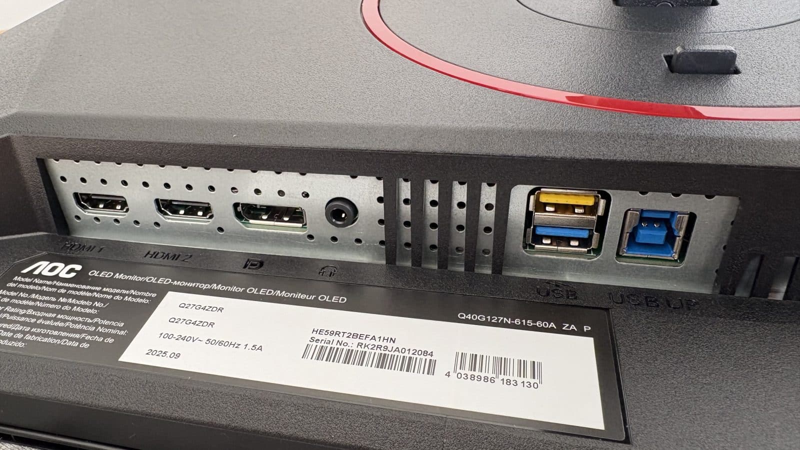 Côté connectique, l’AOC Q27G4ZDR propose l’essentiel pour un écran gaming moderne. On y trouve deux HDMI 2.1, un DisplayPort et un hub USB pratique pour connecter des périphériques. En revanche, l’absence de port USB-C avec alimentation limite un peu l’usage avec un ordinateur portable, notamment dans une optique bureau hybride, mais ce n’est pas là qu’on l’attend, donc pas de panique.