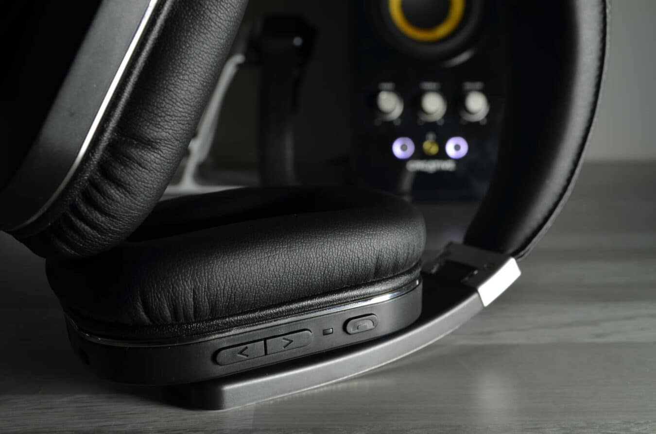 Les commandes se retrouvent à l’arrière de l’oreillette droite, pour les dissimuler. C’est ici que nous prendrons le contrôle du volume ainsi que le changement des musiques en appuyant longtemps sur le bouton. L’autre bouton permet d’allumer le casque (en appuyant longtemps lors du démarrage, on lance la recherche Bluetooth) et de répondre à un appel. Sur le dessous de l’oreillette gauche, l’Audiomax cache un port USB pour le recharger ainsi qu’une prise jack pour l’utiliser en filaire. D’ailleurs, notre fameux casque dispose d’une batterie pouvant lui faire parcourir 19h d’écoute musicale ! On a réussi à tenir environ 18h, ce qui est une belle promesse et un casque qui pourra vous être utile durant toute une semaine sans le recharger.