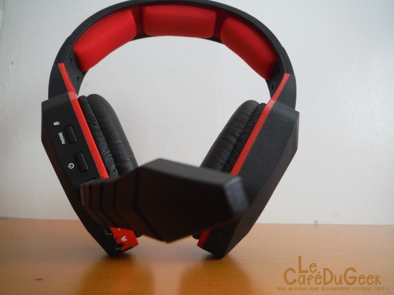 Enfin, j’aimerais insister sur le design de ce premier casque. Ce dernier est chargé, avec des formes rectangulaires et triangulaires. Le rouge et le noir s’allient très bien. Ce casque Circum-Aural (qui entoure l’oreille) assure une bonne étanchéité acoustique. Le boitier varie entre rouge et bleu lorsqu’il n’est pas connecté et est rouge lorsqu’il l’est. Le casque lui clignote en rouge et ne varie pas de fréquence quand il est connecté. Pour le boitier et le caque, c est le logo Spirit-of-Gamer (toujours très volumineux) qui clignote.