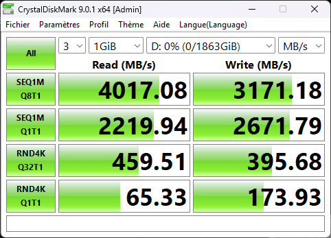 Le Corsair EX400U se distingue par des performances élevées qui approchent les chiffres annoncés par le fabricant. En lecture, les 4000 MB/s sont tenus, tandis que l’écriture atteint 3200 MB/s dans la pratique, malgré une promesse de 3600 MB/s. Cette stabilité assure une fluidité exemplaire dans tous les usages, qu’il s’agisse de transferts lourds ou d’applications exigeantes. Le design carré et compact renforce cette impression de produit moderne et parfaitement adapté aux besoins actuels.7