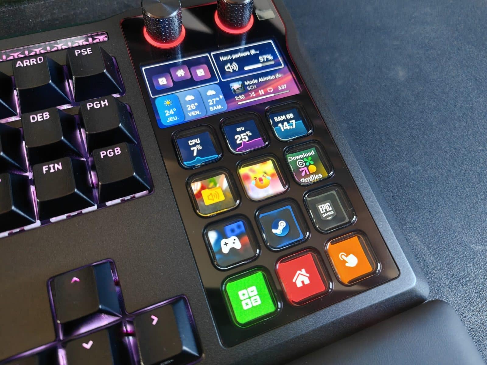 Parlons maintenant de ce StreamDeck intégré. Comme mentionné auparavant, il faudra passer par le logiciel maison d’Elgato pour le configurer. Ci-dessous le profil quasi par défaut fourni, avec pas moins de sept écrans différents. Accès aux ressources du PC, soundbox, raccourcis Discord, accès à Steam, etc. Chaque icône peut être personnalisée avec des GIFs animés ou des visuels propres à votre setup, rendant l’interface aussi esthétique qu’utile. Les possibilités sont infinies et on reconnait au premier coup d’œil la qualité de conception logicielle made in Elgato. L’écosystème de plug-ins est d’ailleurs si vaste qu’il permet de piloter ses lumières connectées ou de surveiller ses statistiques de jeu en temps réel sans jamais quitter son clavier des yeux.