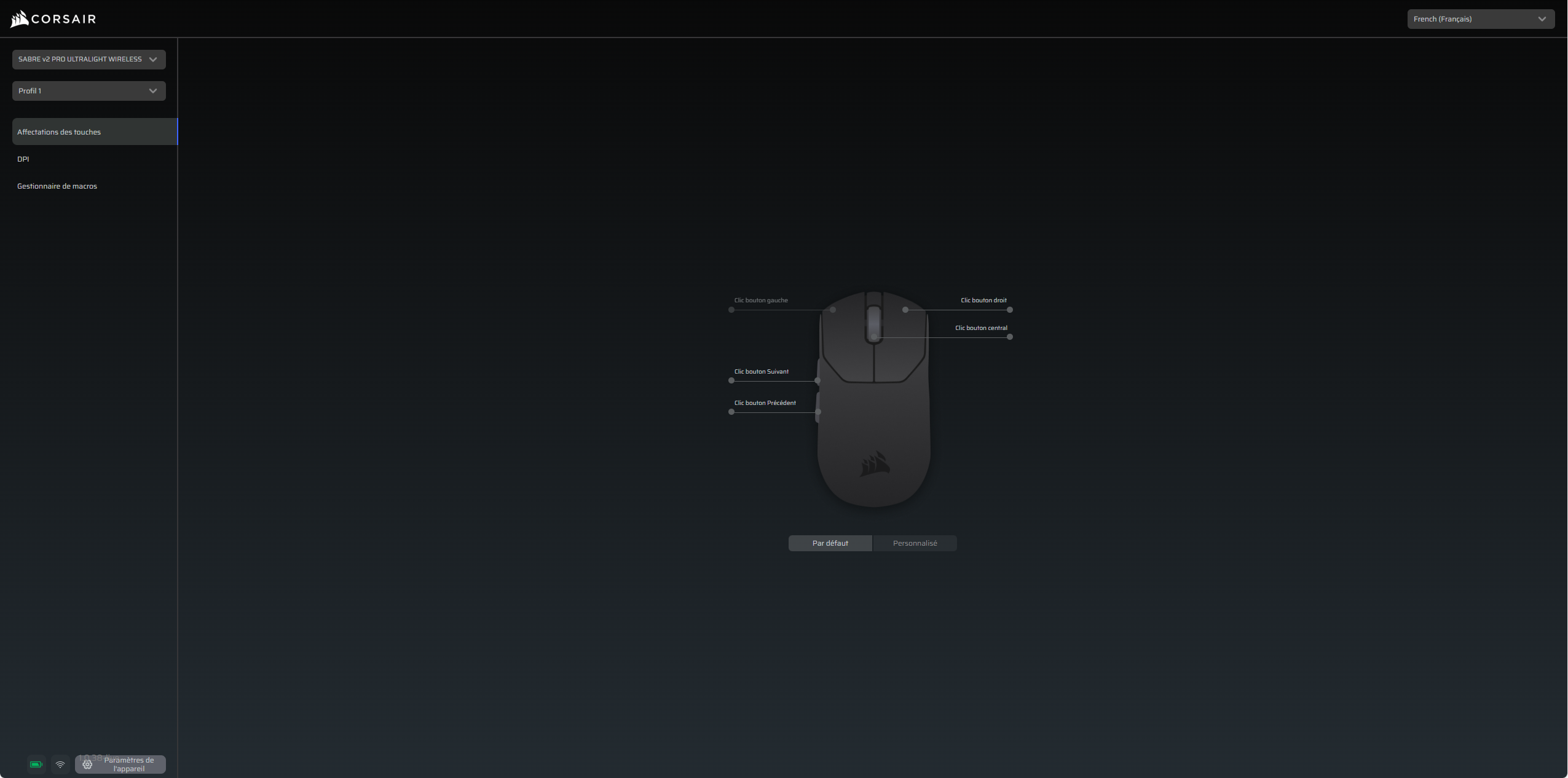 Avec la Corsair Sabre V2 Pro Ultralight Wireless, la marque abandonne iCue pour un tout nouvel outil : le Corsair Web Hub. Accessible directement depuis un navigateur, il permet de configurer la souris sans installer le moindre logiciel. Ainsi, l’approche est légère, rapide et parfaitement cohérente avec la philosophie du produit. L’interface web permet d’ajuster les DPI, de modifier les profils, de créer des macros ou de remapper les boutons en quelques clics. Le tout est fluide et sans superflu, avec une prise en main immédiate. On apprécie particulièrement le fait que tout soit centralisé en ligne, évitant les lourdeurs logicielles habituelles. Cela rend la souris compatible avec plus d’environnements et réduit l’encombrement sur le système.