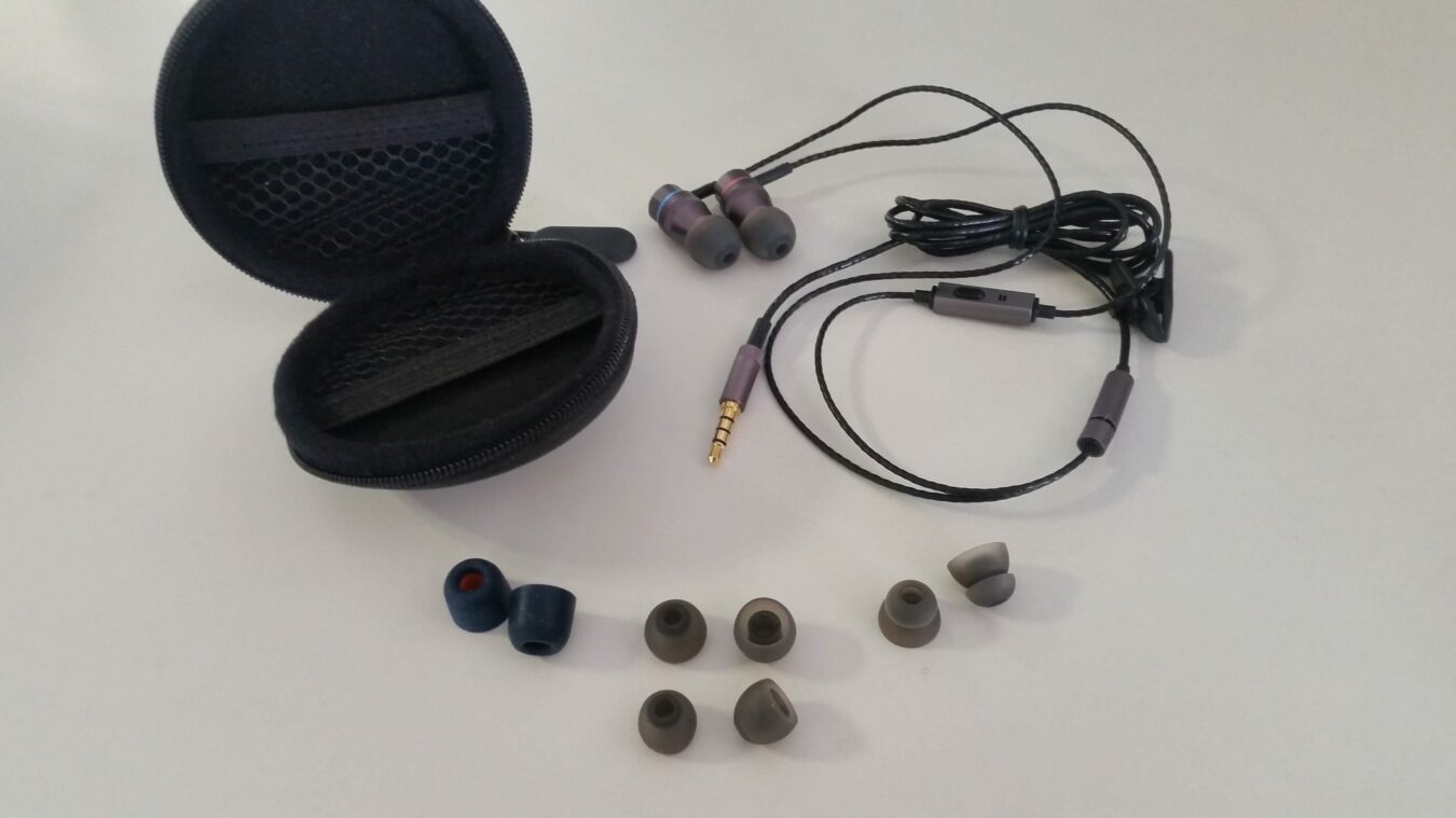On reçoit une boite particulièrement petite qui cache malgré tout, beaucoup plus d’éléments que ce que l’on peut s’imaginer. En retirant la boite, on remarque une paire d’écouteurs, à moitié rangés dans une petite pochette ronde. Autour de celle-ci sont positionnées 3 types d’embouts différents. On en retrouvera un type d’embout de plus dans la pochette.
