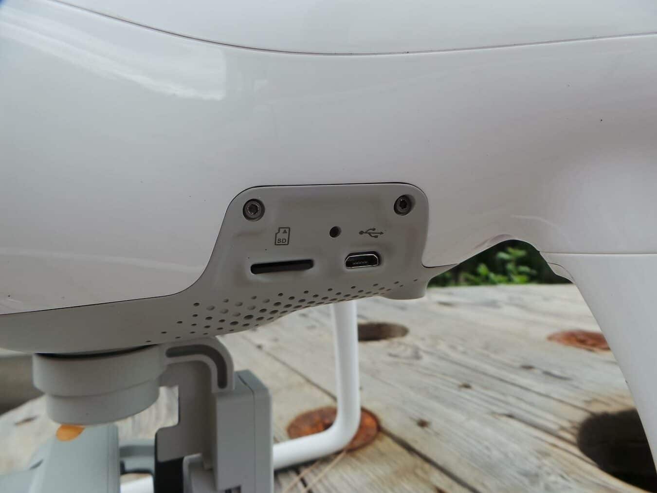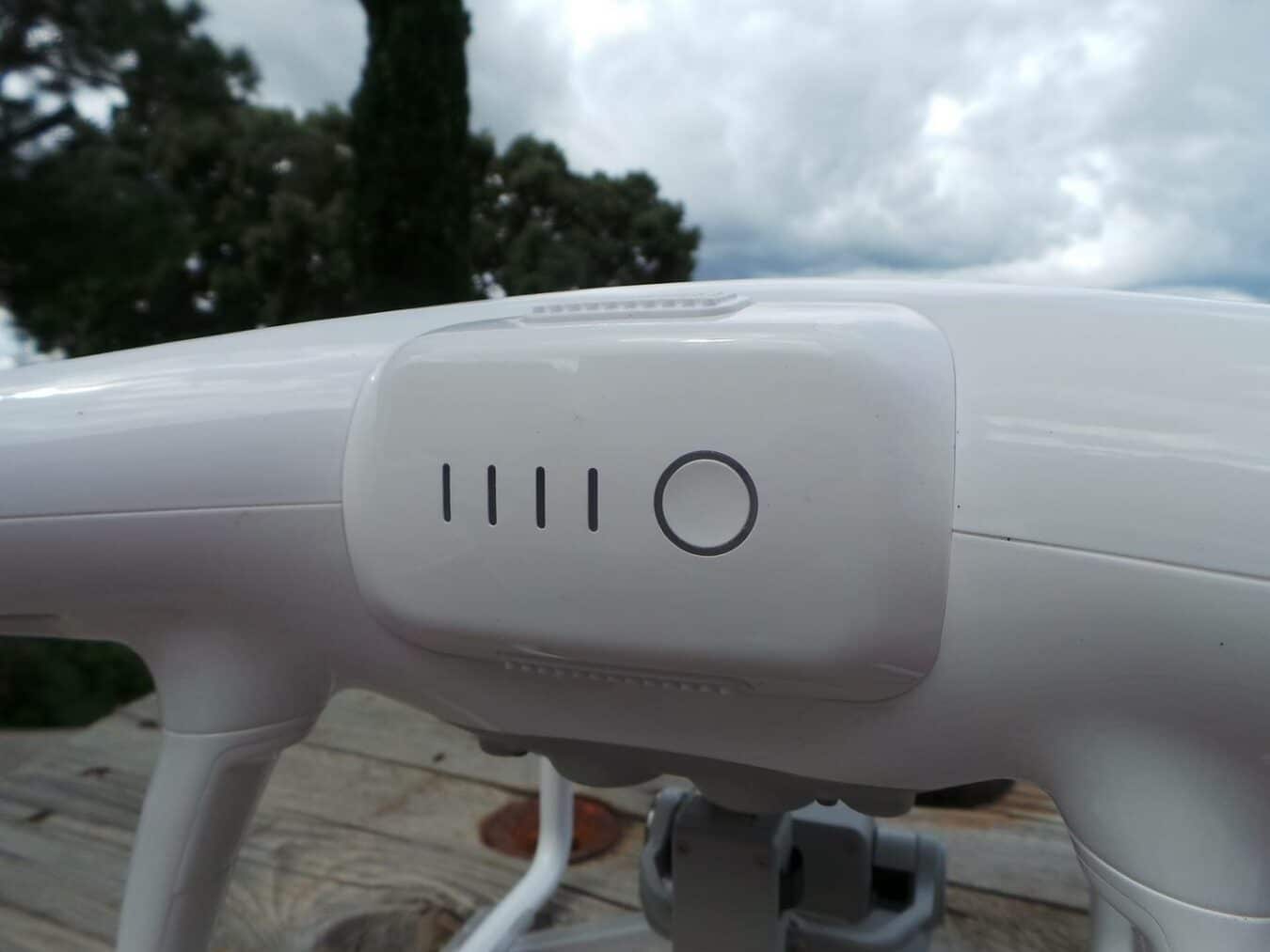 Il est maintenant temps de rentrer dans les détails extérieurs de ce drone. Sur la face supérieure trône fièrement le logo Dji, légèrement brillant. La face avant, quant à elle, présente la batterie amovible ainsi que le bouton d’allumage et un indicateur du pourcentage restant. La partie stockage se situe sur le côté du drone, accompagné par le port USB qui sera utilisé pour la mise à jour du firmware par exemple.