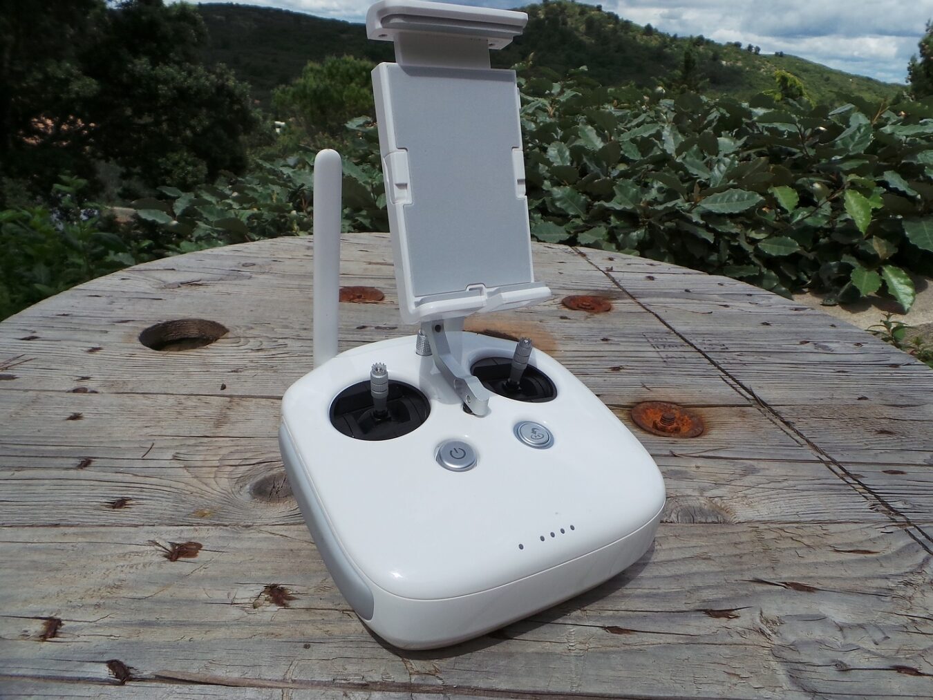 Place maintenant à la télécommande fournie avec, qui offre une portée théorique allant jusqu’à 5km. Rien que ça. Cette télécommande est dotée d’un support pour poser un smartphone ou une tablette, qui servira d’écran de contrôle et afficheront toutes les informations relatives au drone (vitesse horizontale et verticale, altitude depuis le point de départ, etc.), tout ça grâce à l’application Dji Go disponible sur Android et iOS. À savoir que tous les smartphones et tablettes ne sont pas officiellement supportés, pour le moment.
