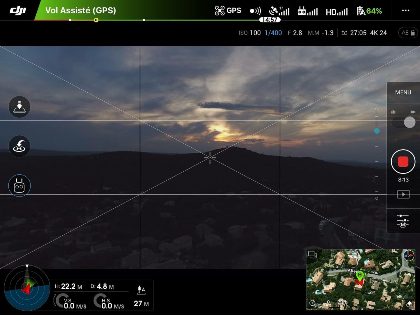 Sur le haut de l’écran, un récapitulatif de l’état du drone comme le niveau de batterie restant, le temps de vol restant (qui varie en fonction de votre utilisation du drone sur le moment), le nombre de satellites captés, le niveau de batterie de la manette, etc.. Juste en dessous sont situées les informations relatives à l’enregistrement photo/vidéo. Il est possible de régler manuellement plusieurs paramètres comme l’ISO ou la vitesse d’obturation.