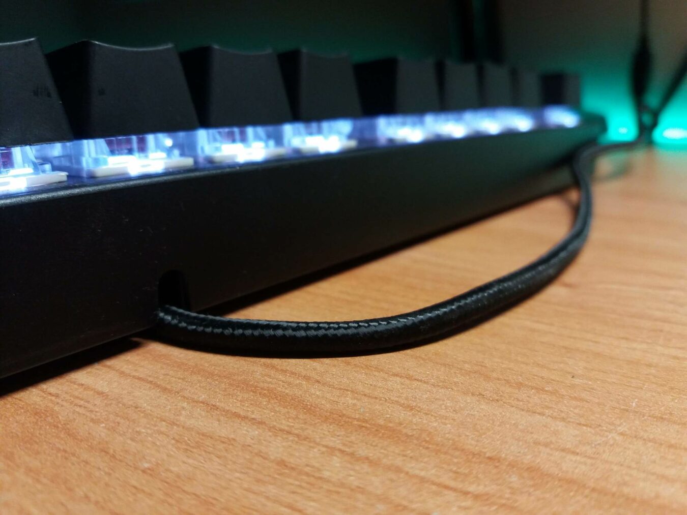On retrouve également un câble en nylon tressé. L’avantage de celui-ci est que les câbles tressés ont généralement tendance à plus durer dans le temps et participe également à l’esthétique du clavier. Le dessous est équipé d’emplacement permettant de ranger celui-ci d’un côté ou de l’autre.