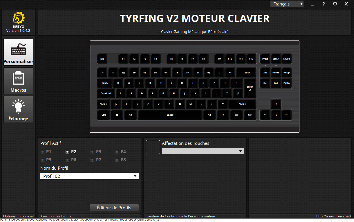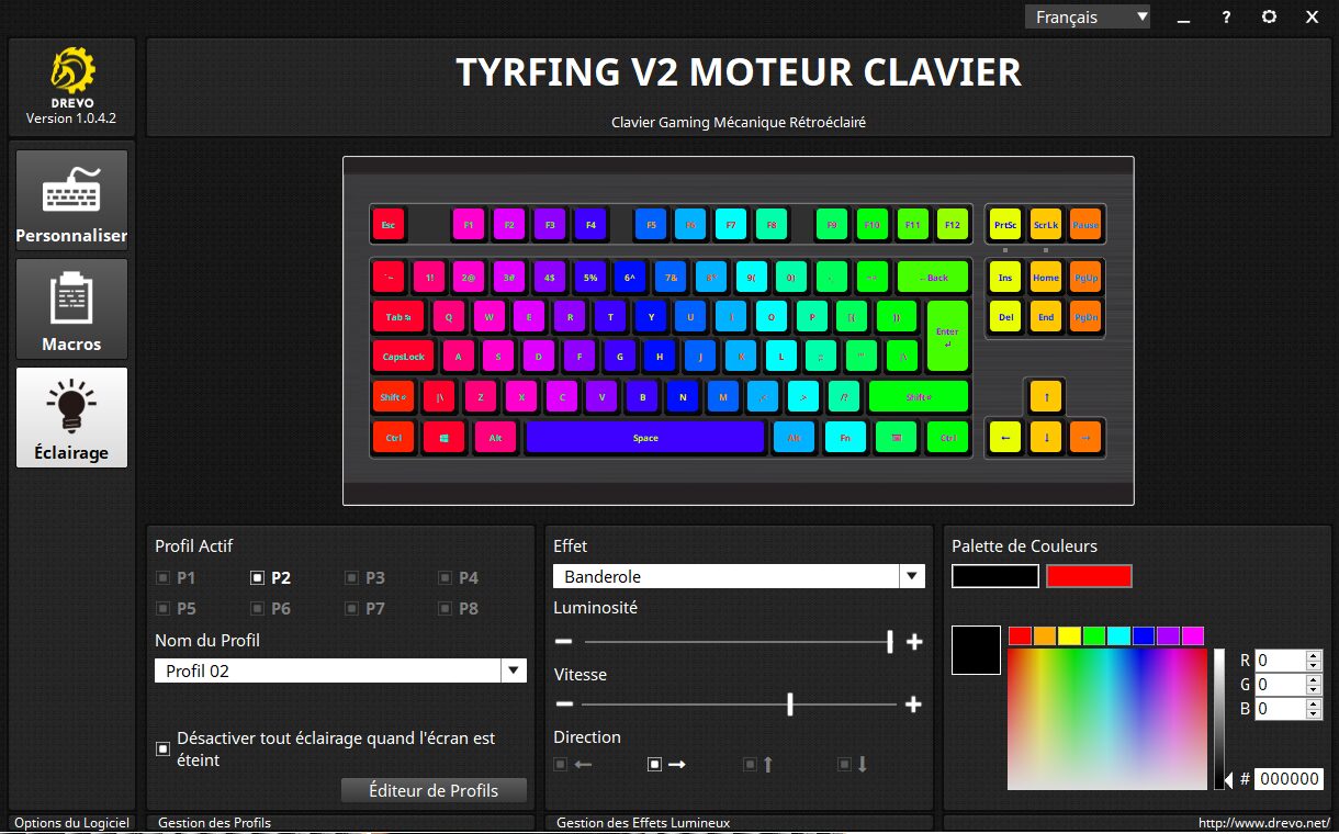 DREVO met à disposition un logiciel permettant la customisation des couleurs du clavier, mais également les accès rapides. Les possibilités sont énormes du fait du nombre de modèles proposés.