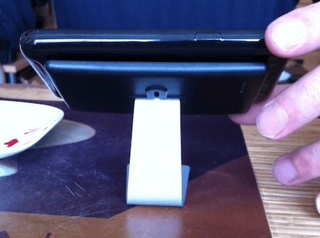 Et de retour à la maison, un petit support sympa permettra de faire la même chose (a l’envers sur la photo, la partie plane se met au dos du smartphone). Ainsi les 2 supports ont leur local et donc pas besoin d’en transporter un partout !