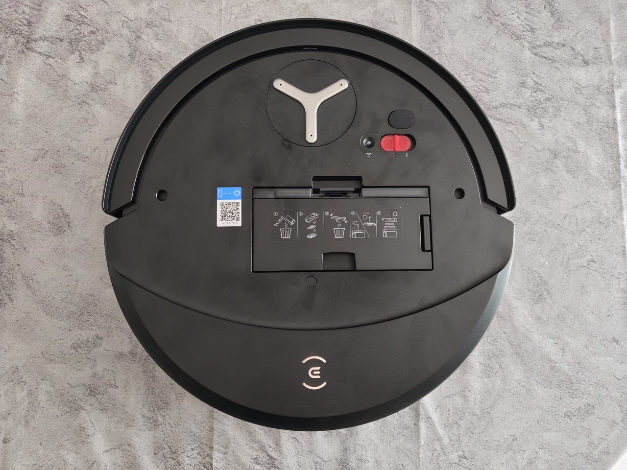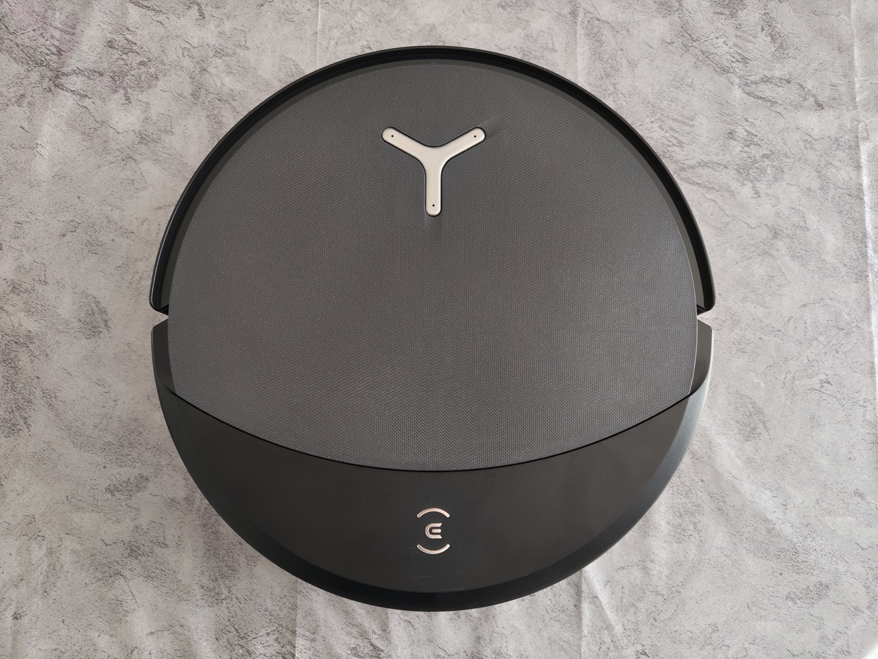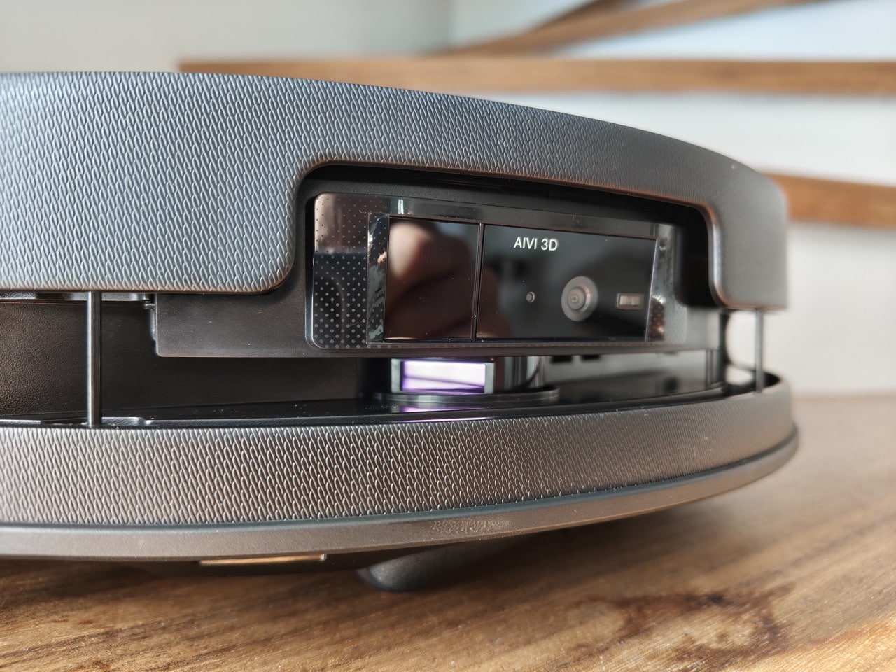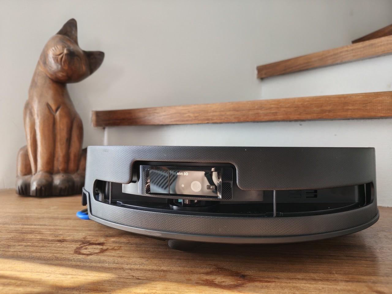 Ecovacs fait ici le choix d’un design relativement discret, presque minimaliste. Le robot adopte une silhouette plus basse que certains concurrents, notamment grâce à l’absence du traditionnel capteur LiDAR proéminent. Ce détail a son importance puisqu’il lui permet de passer sous davantage de meubles, un point souvent négligé.