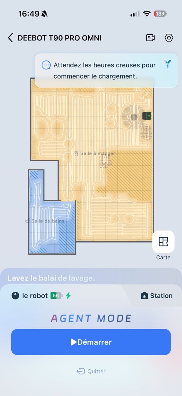 Et même lorsque ce n’est pas le cas, le robot gère parfaitement la situation. Il retourne se recharger, puis reprend automatiquement son nettoyage là où il s’était arrêté.