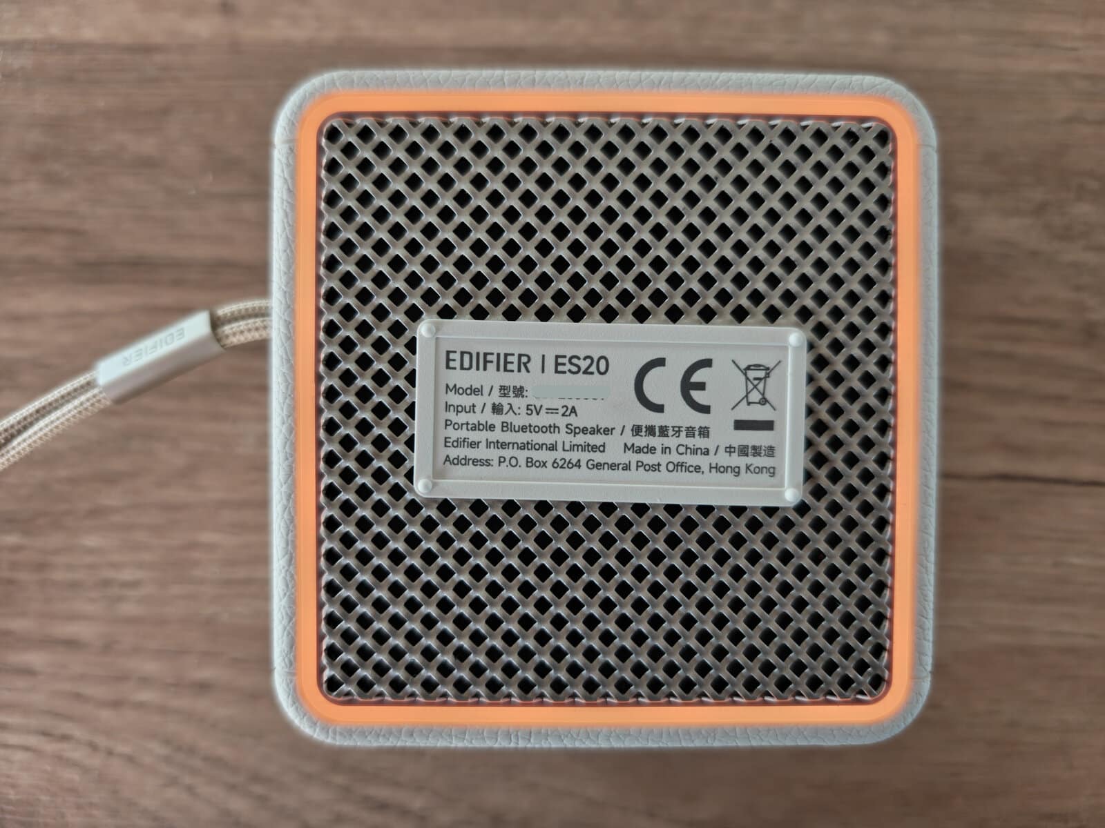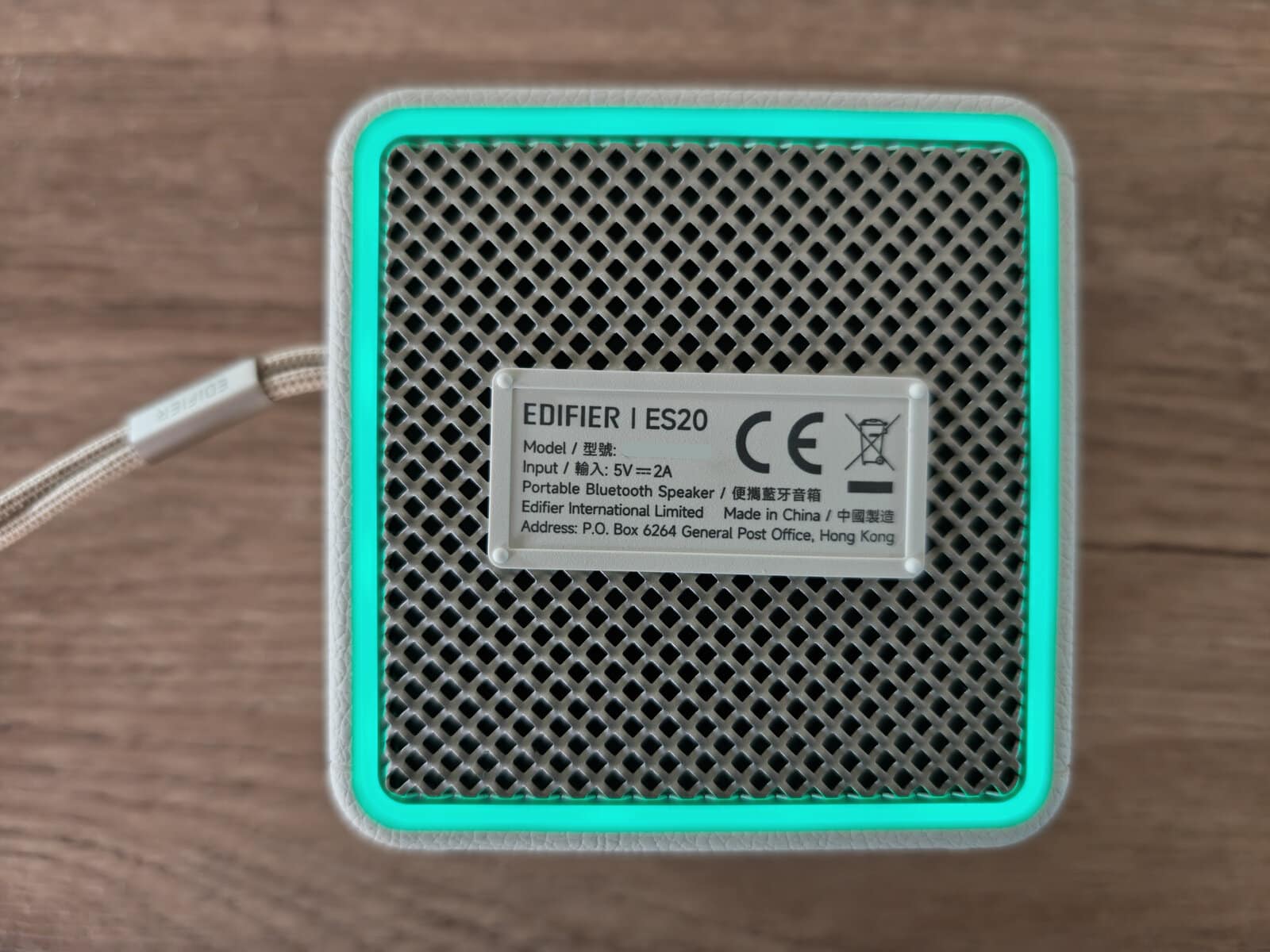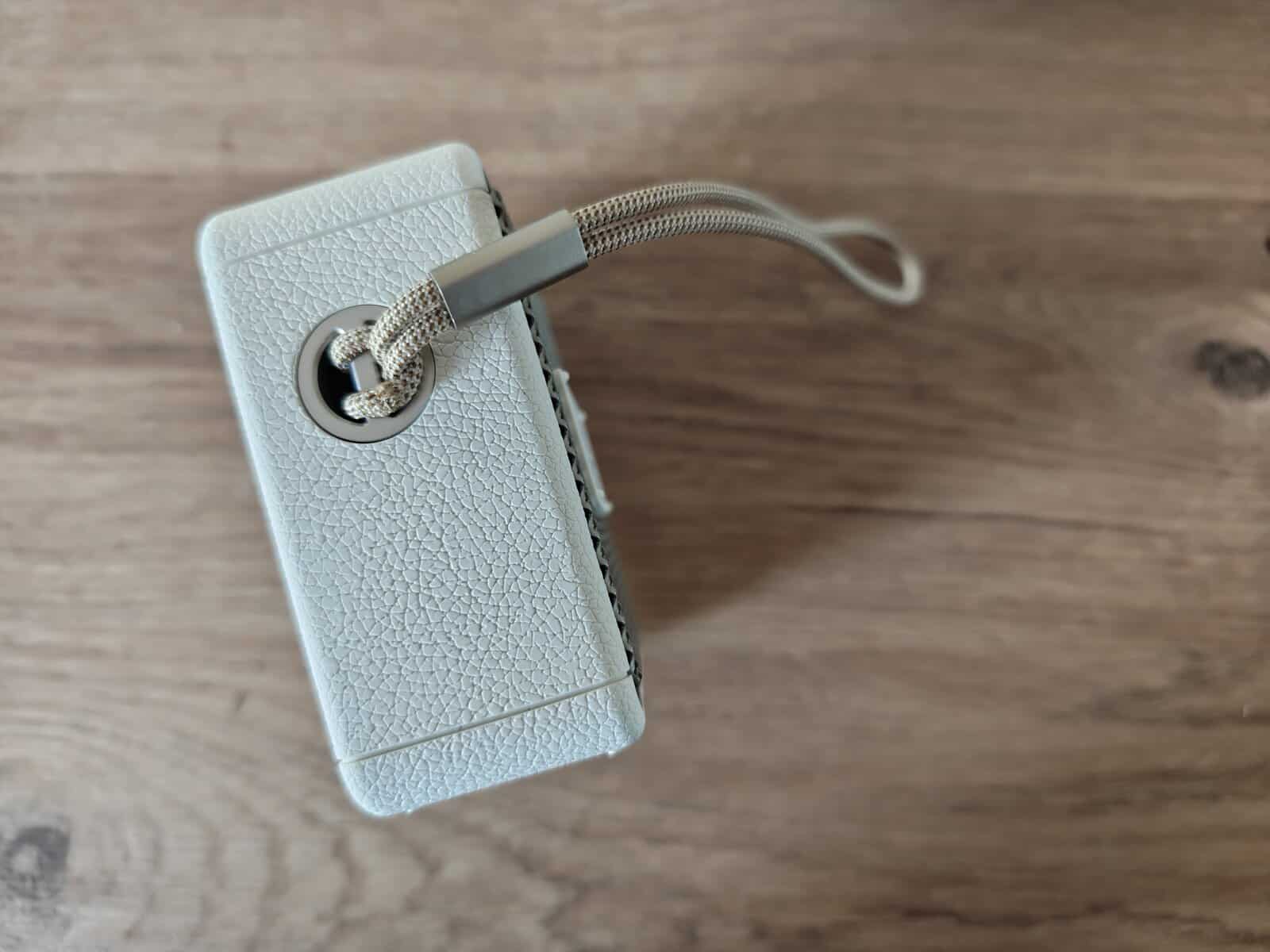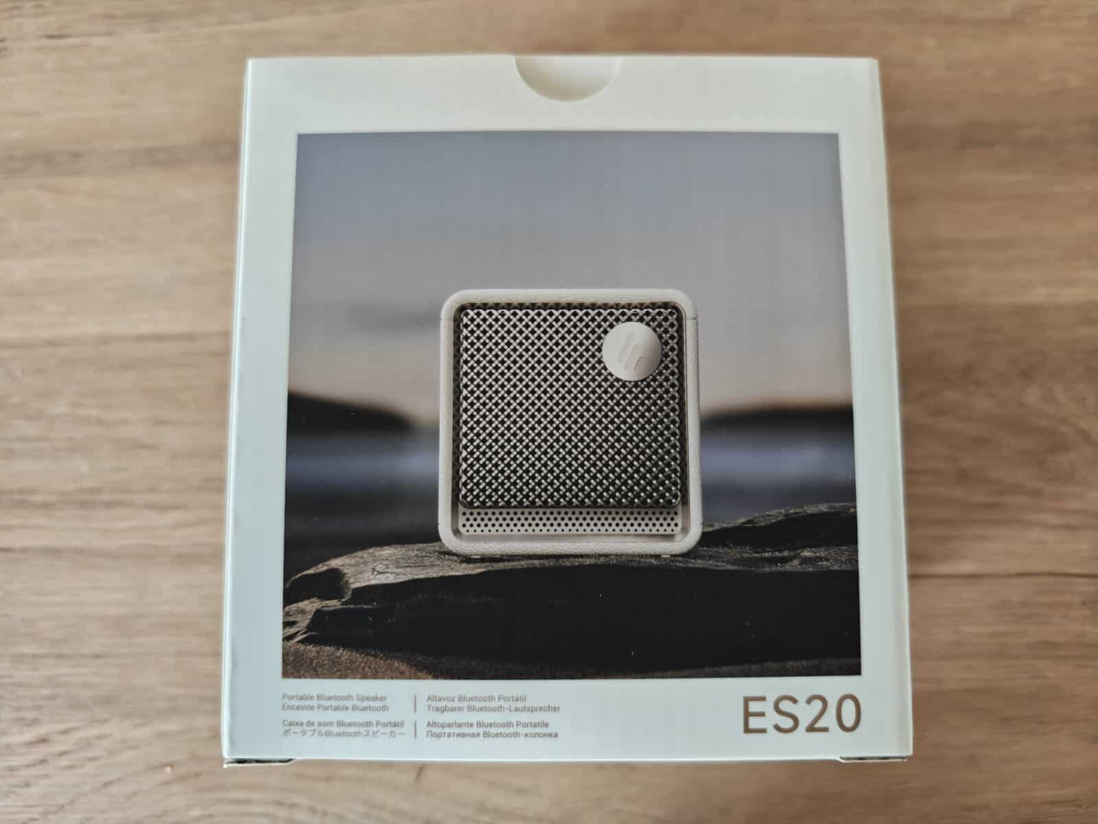 Dans la boîte se trouvent l’enceinte ES20, un câble USB-C, un câble USB-C vers USB-A, une dragonne et un manuel. Le design est soigné : revêtement imitation cuir doux au toucher, boutons placés sur le dessus, éclairage en anneau à l’arrière. Avec des dimensions de 90,4 × 93,7 × 49,7 mm et un poids de 326 g, elle reste très maniable pour transporter. Le style rétro est assumé, sans excès.