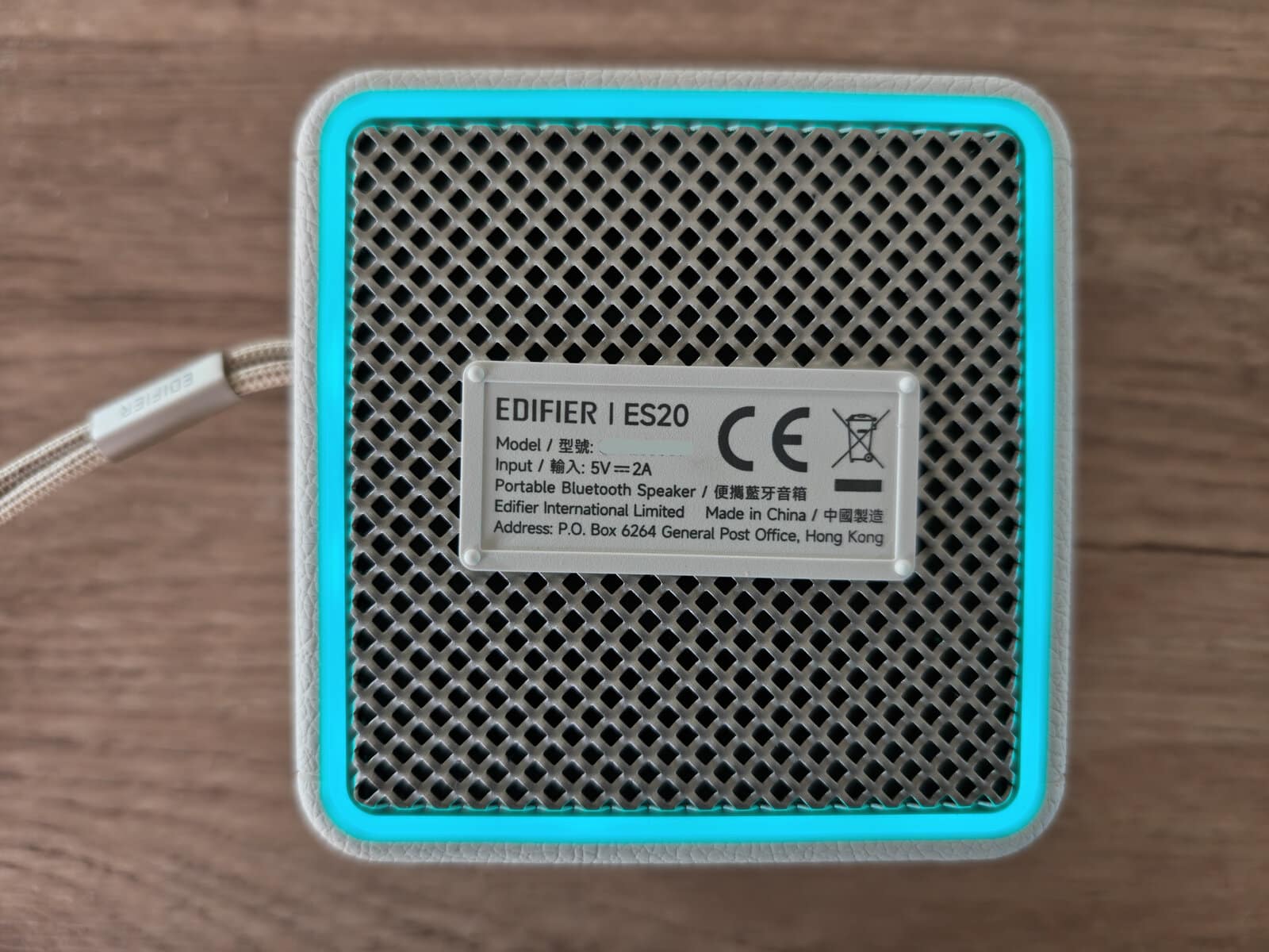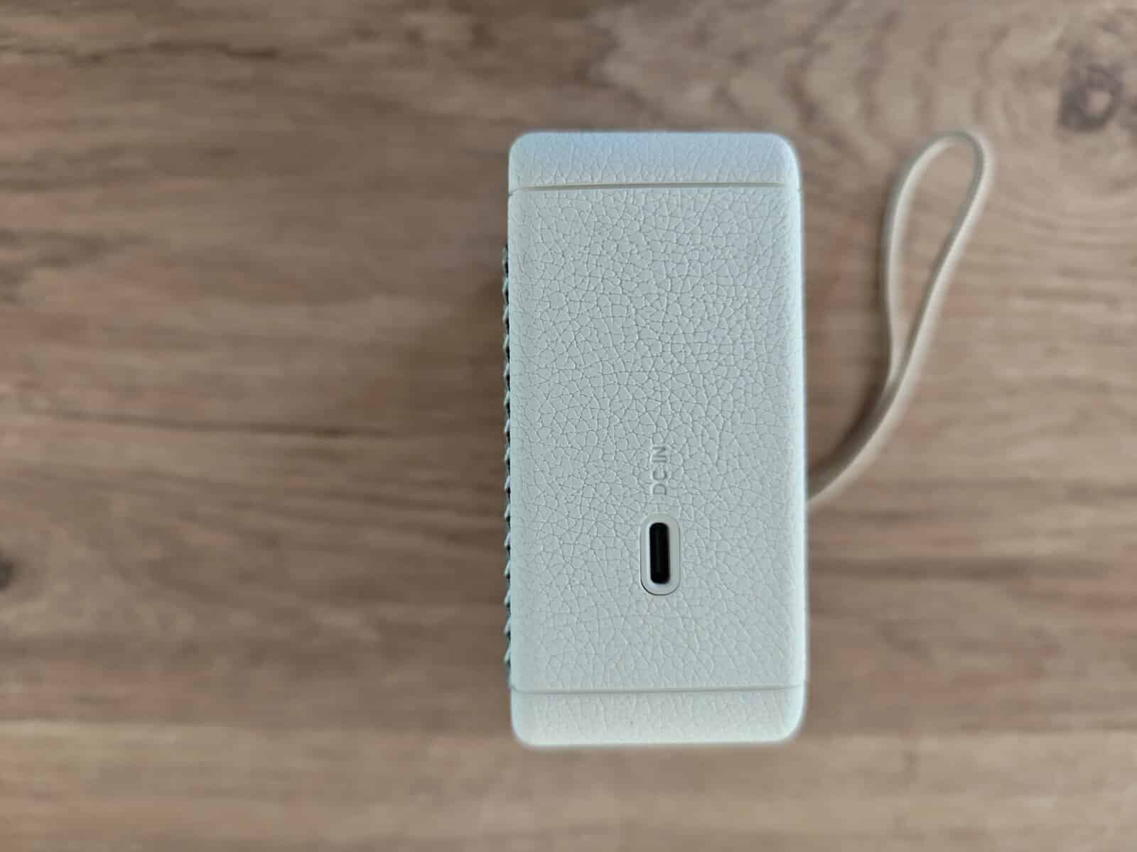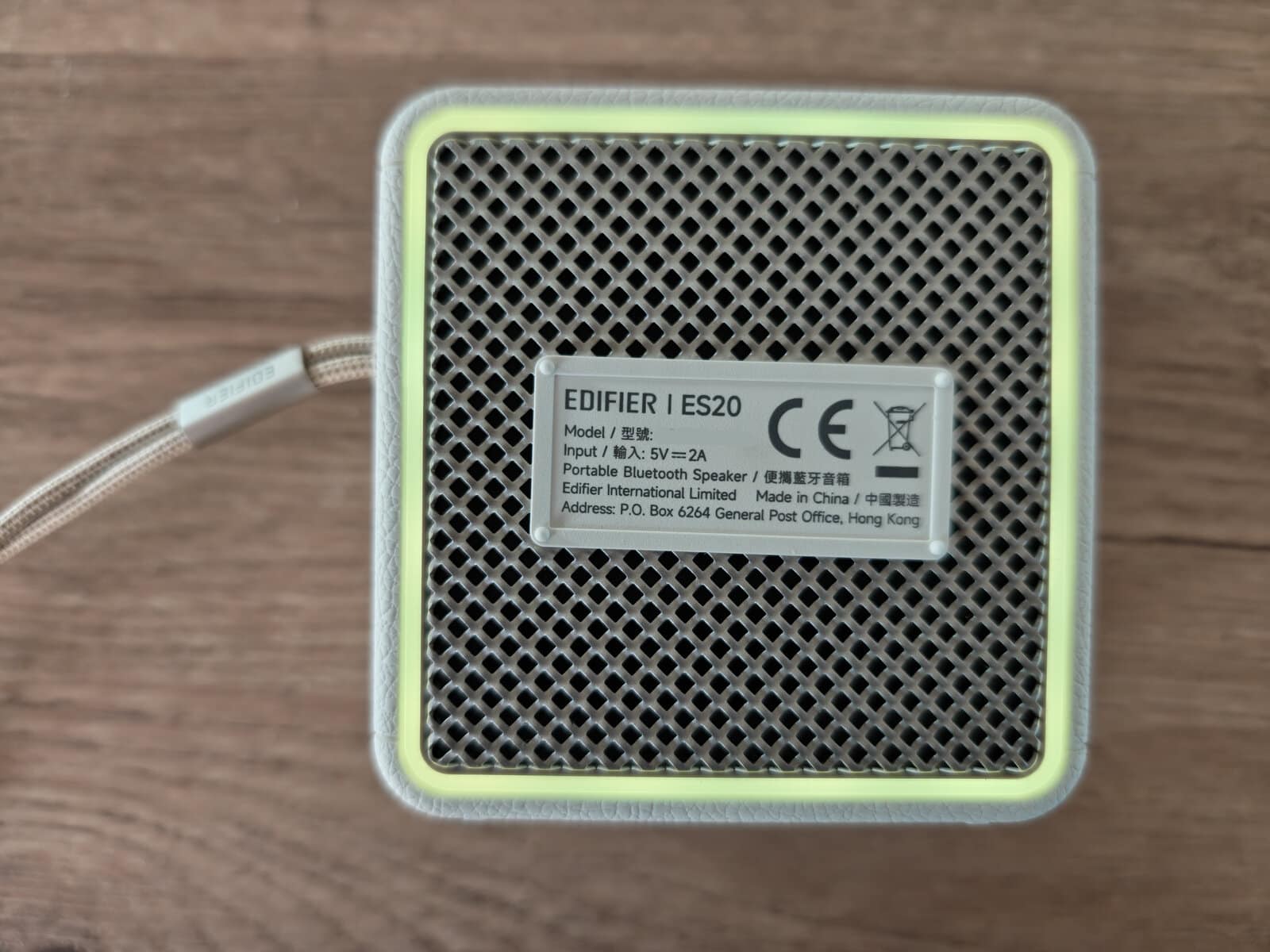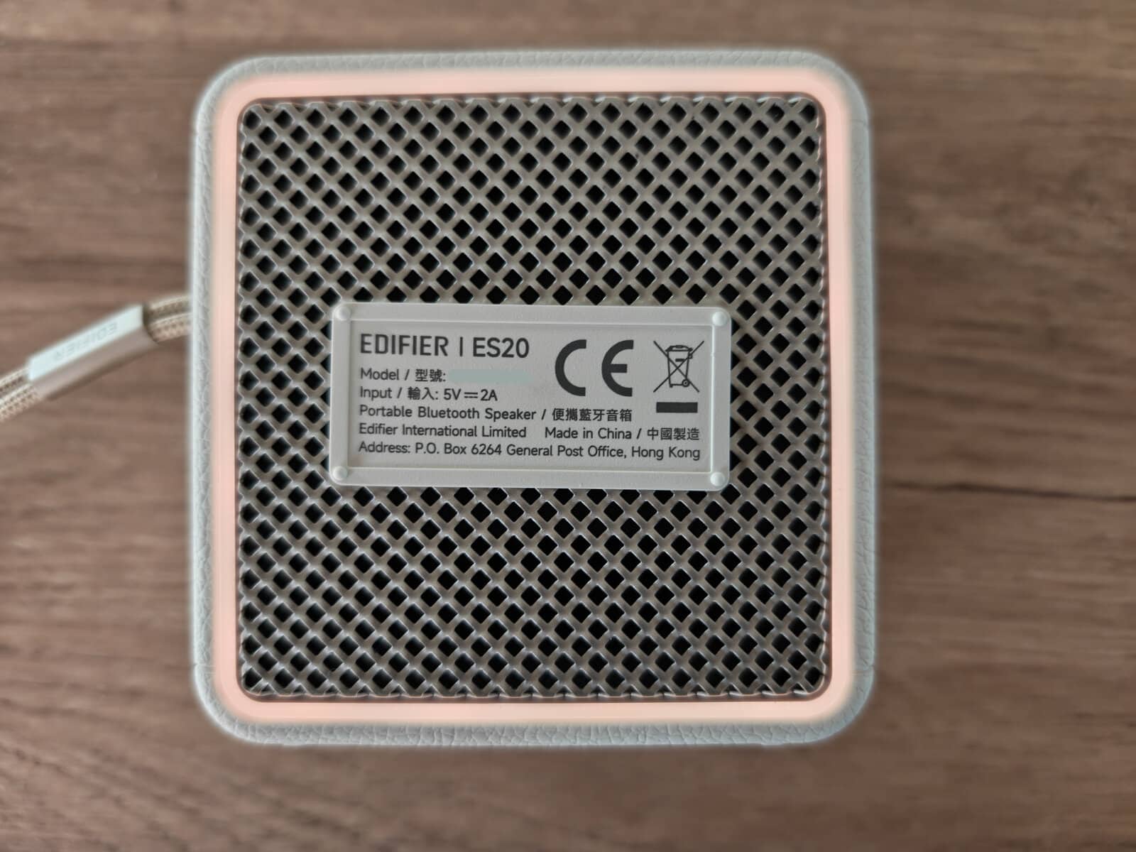Dans la boîte se trouvent l’enceinte ES20, un câble USB-C, un câble USB-C vers USB-A, une dragonne et un manuel. Le design est soigné : revêtement imitation cuir doux au toucher, boutons placés sur le dessus, éclairage en anneau à l’arrière. Avec des dimensions de 90,4 × 93,7 × 49,7 mm et un poids de 326 g, elle reste très maniable pour transporter. Le style rétro est assumé, sans excès.