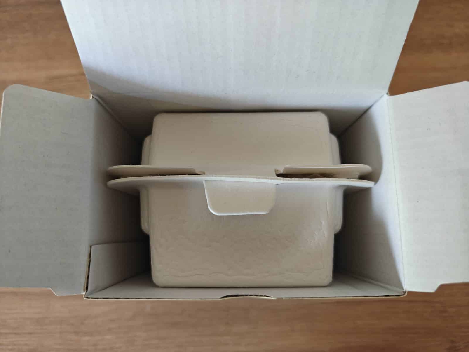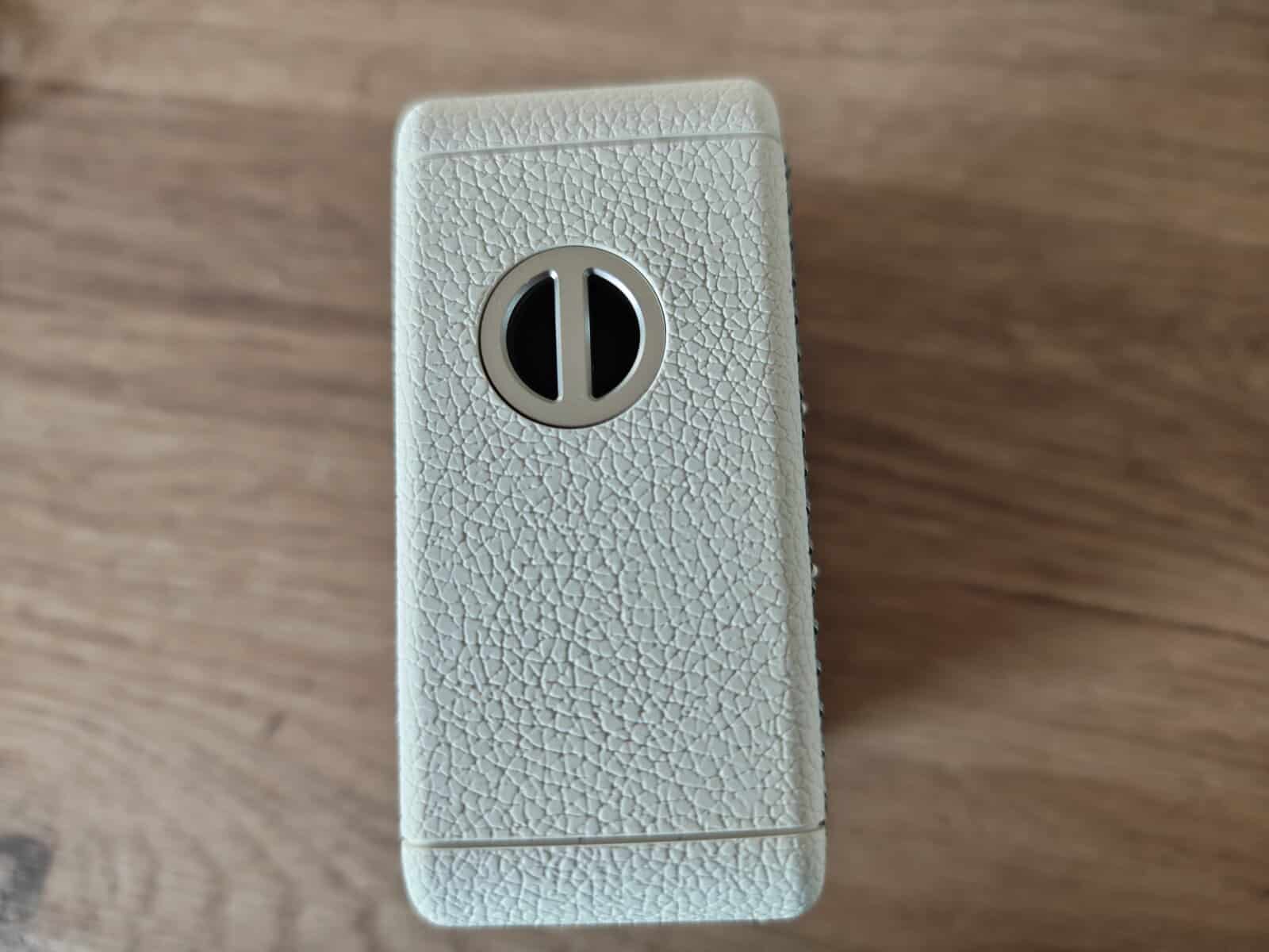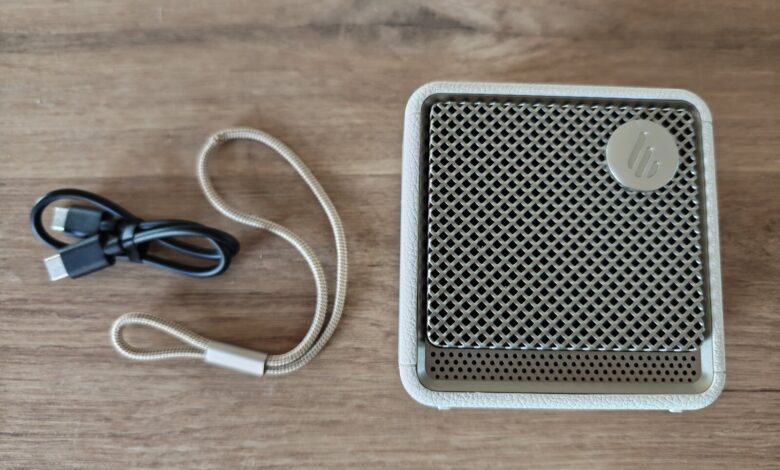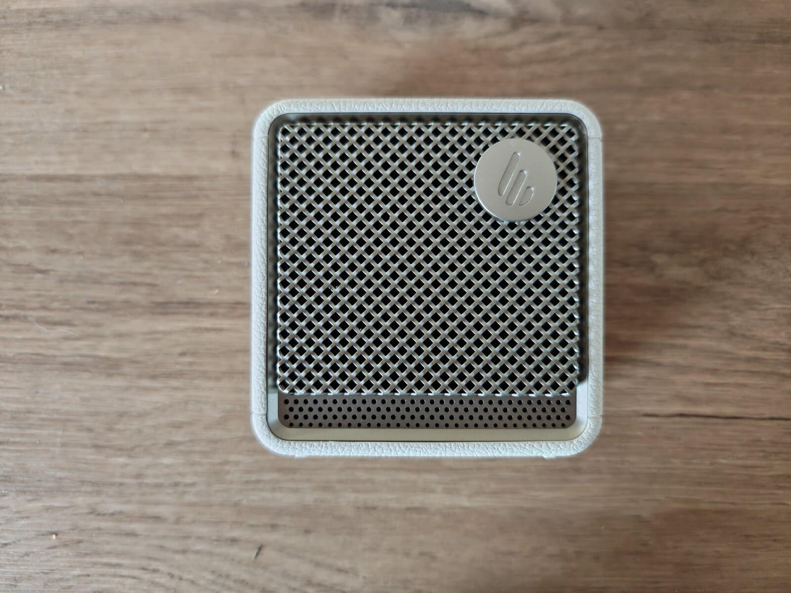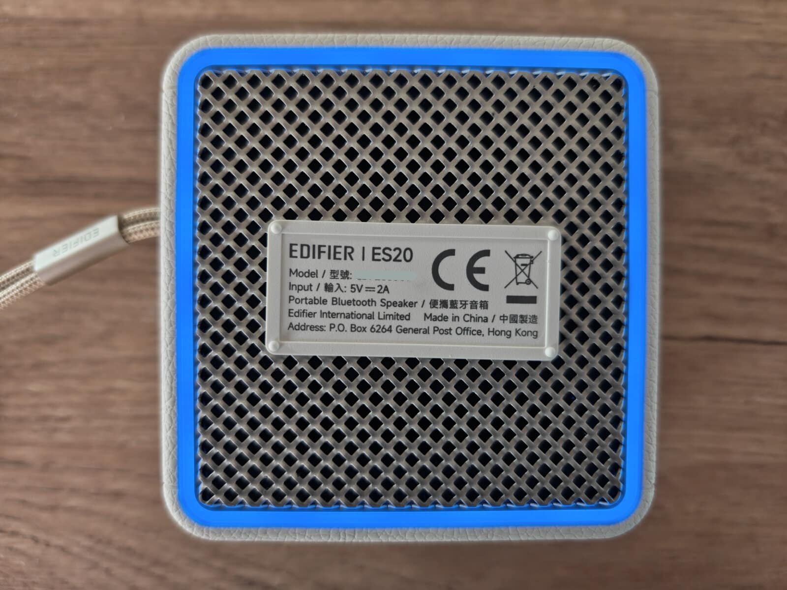 Dans la boîte se trouvent l’enceinte ES20, un câble USB-C, un câble USB-C vers USB-A, une dragonne et un manuel. Le design est soigné : revêtement imitation cuir doux au toucher, boutons placés sur le dessus, éclairage en anneau à l’arrière. Avec des dimensions de 90,4 × 93,7 × 49,7 mm et un poids de 326 g, elle reste très maniable pour transporter. Le style rétro est assumé, sans excès.