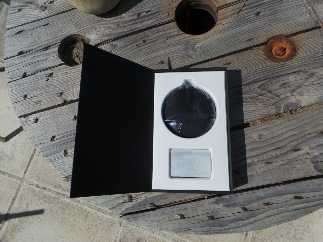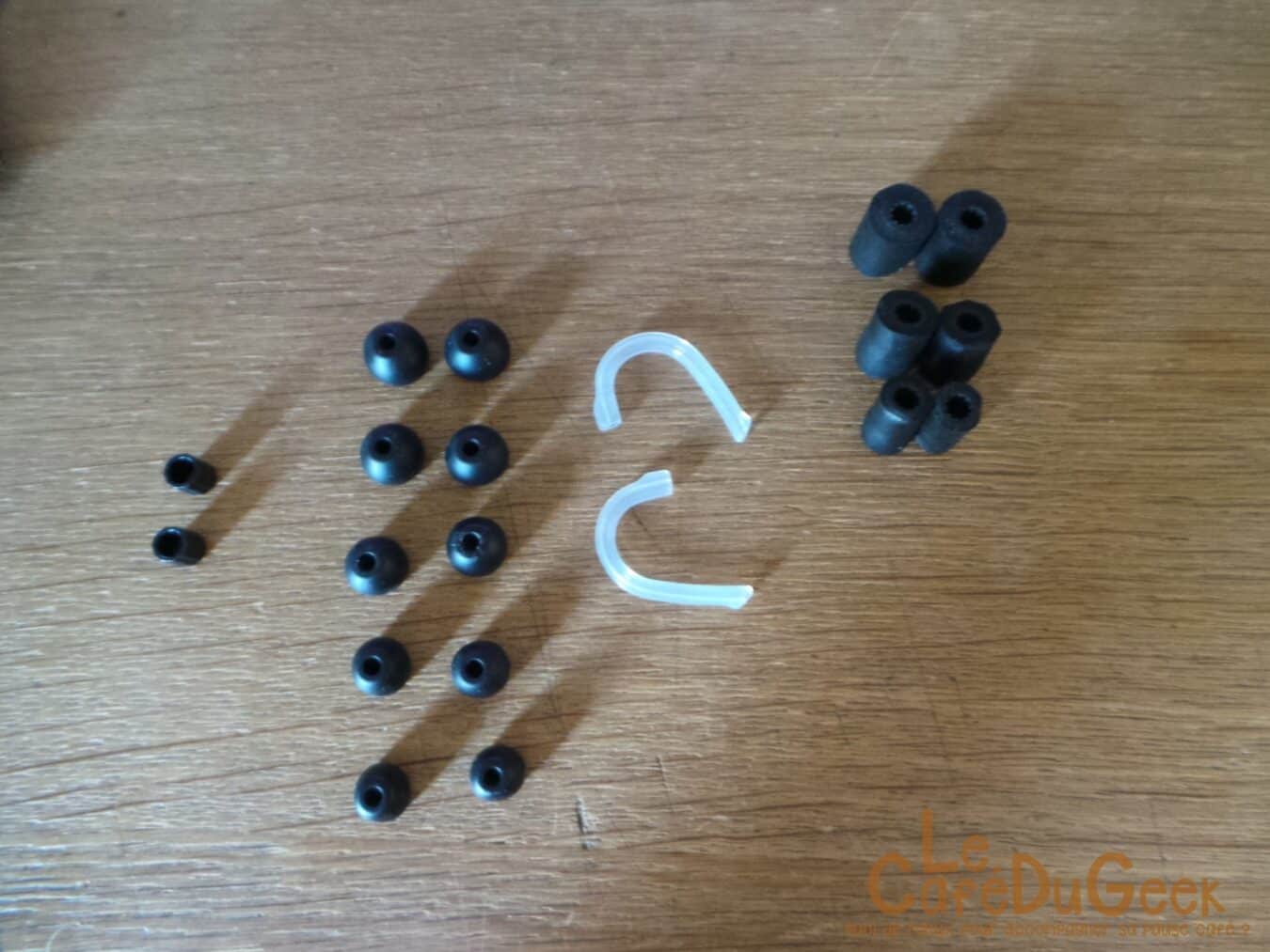 Dès l’Ouverture de la boîte le côté très premium des écouteurs ressort. Un boitier rond et deux sachets emballés et c’est tout. Le boitier contient les écouteurs tandis que les deux sachets contiennent les différents embouts, qui sont au nombre de 8. Deux types d’embouts sont proposés, les ronds qui sont plutôt banals et 3 autres embouts à mémoire de forme, qui prendront très facilement la forme des oreilles. Deux arcs en silicone sont aussi présents, ils permettent de caler plus précisément les écouteurs pour les utiliser facilement pendant le sport et ainsi éviter la chute.