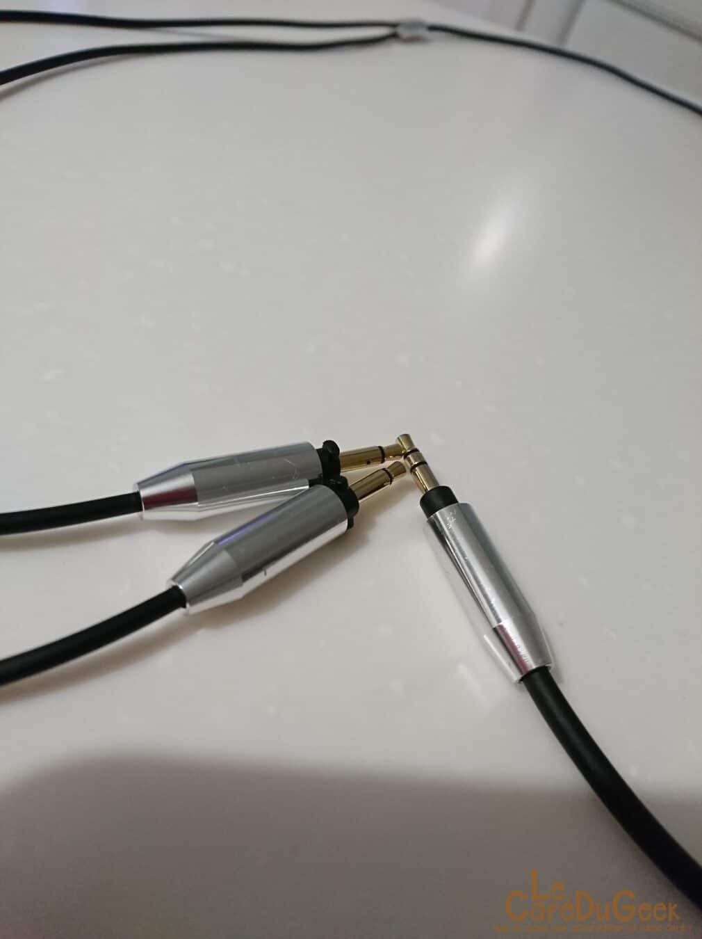 Comme d’habitude Final a le souci du détail et c’est toujours un plaisir que de déballer un de leurs produits. Au premier coup d’œil, la sensation de qualité est encore au rendez-vous. À noter également que l’on retrouve, fourni avec le casque, un adaptateur 3.5mm vers XX. Le câble fourni avec est détachable du casque et se décompose en 1 connecteur jack 3.5 stéréos et 2 connecteur jack 3.5 en mono. Ces derniers viennent directement se brancher sur le casque, avec un système de verrouillage très simple. En effet, il suffit de les brancher et de faire 1/4 de tour dans le sens des aiguilles d’une montre.