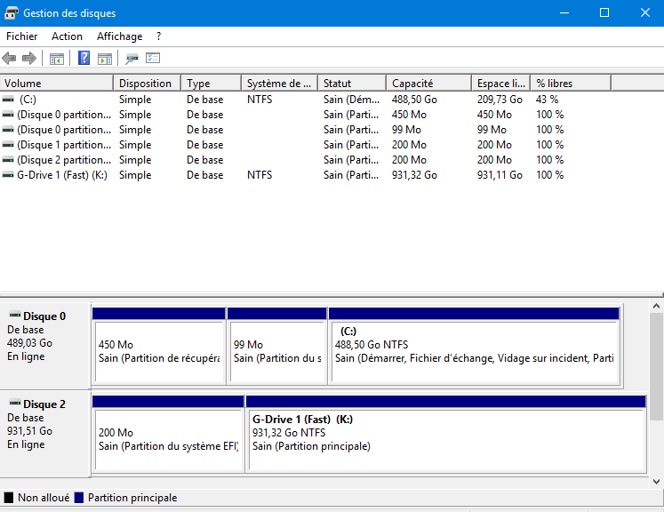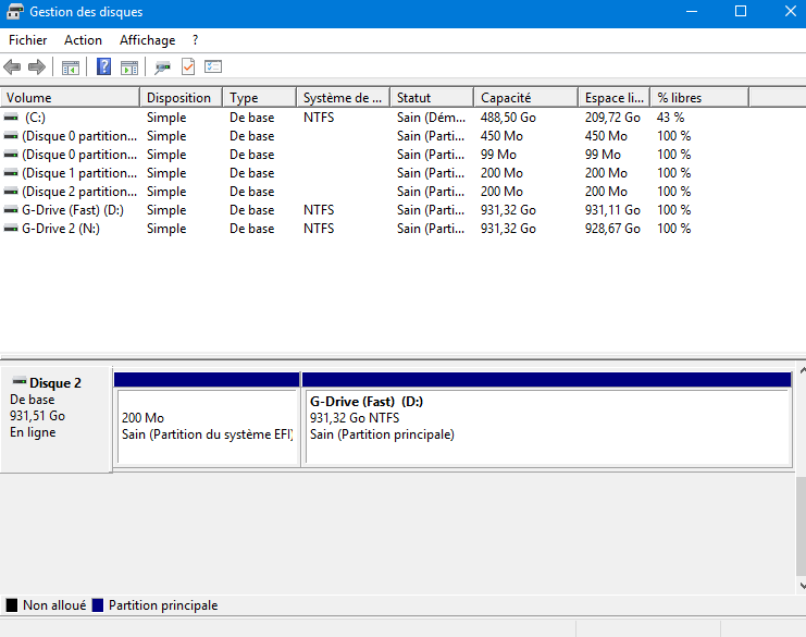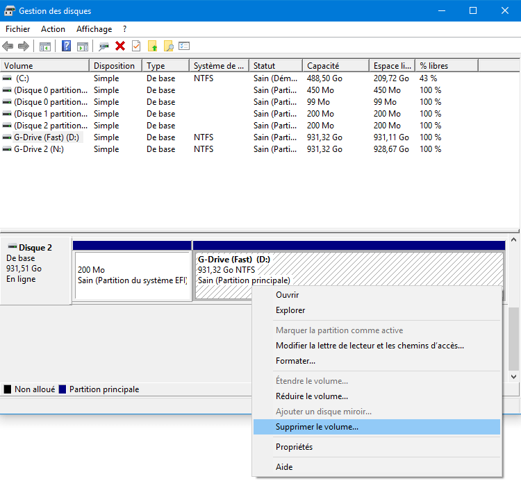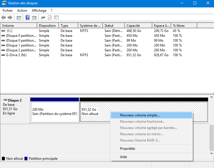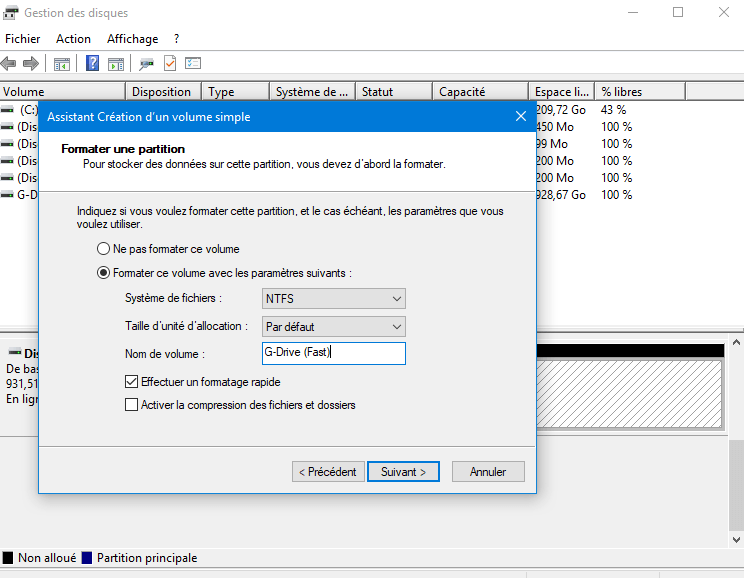 Donc après avoir trouvé votre disque dans le gestionnaire de disques, il faut formater la partition principale ( de 931 Go) du G-Drive.