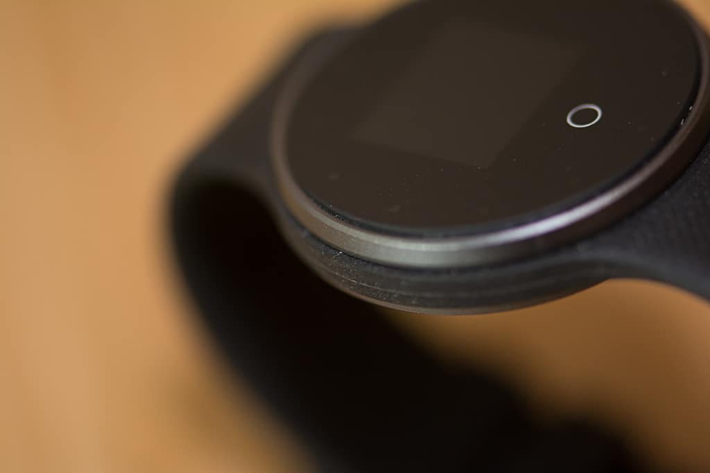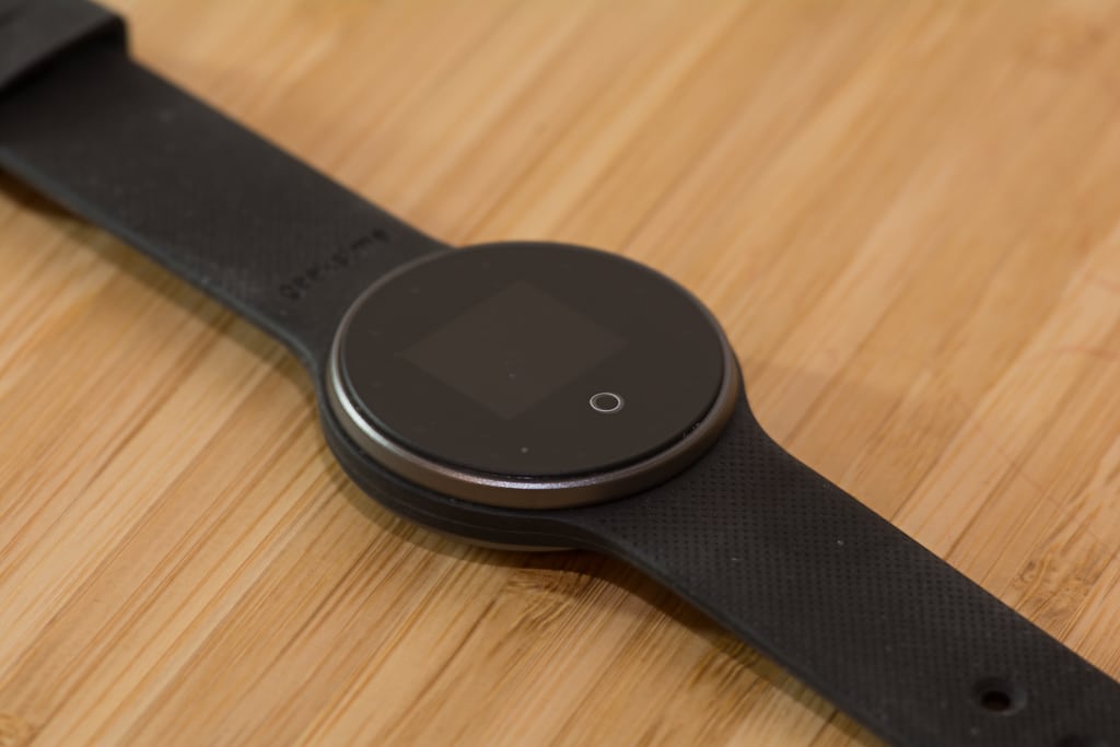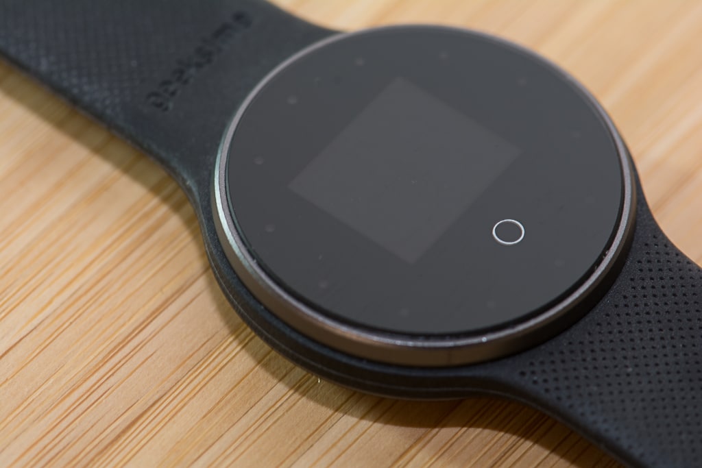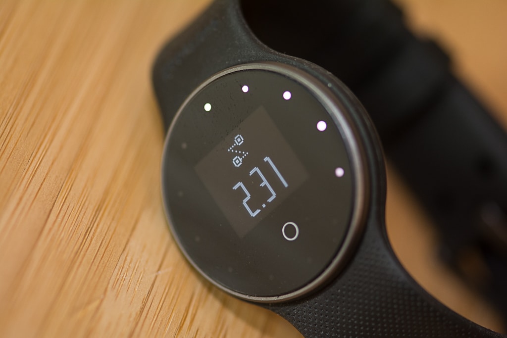 Le produit dispose d’un cadran de 32mm de diamètre intégrant un petit écran monochrome utilisant la technologie OLED. Sur le cadran nous avons 12 diodes blanches qui ont pris la place des habituels numéros d’une montre à aiguilles, elles permettent d’indiquer de façon originale et rapide le progrès effectué en fonction du but défini à l’aide d’une simple pression sur le petit cercle blanc du cadran cachant un bouton tactile.