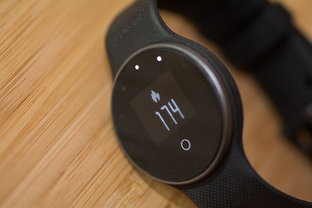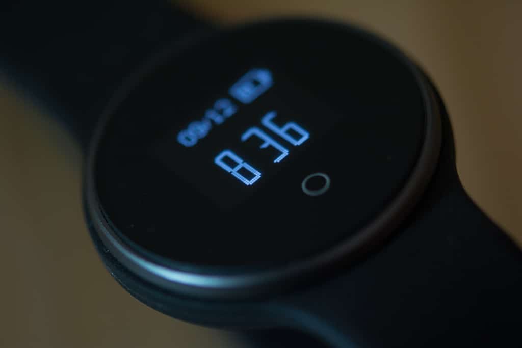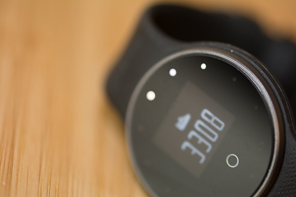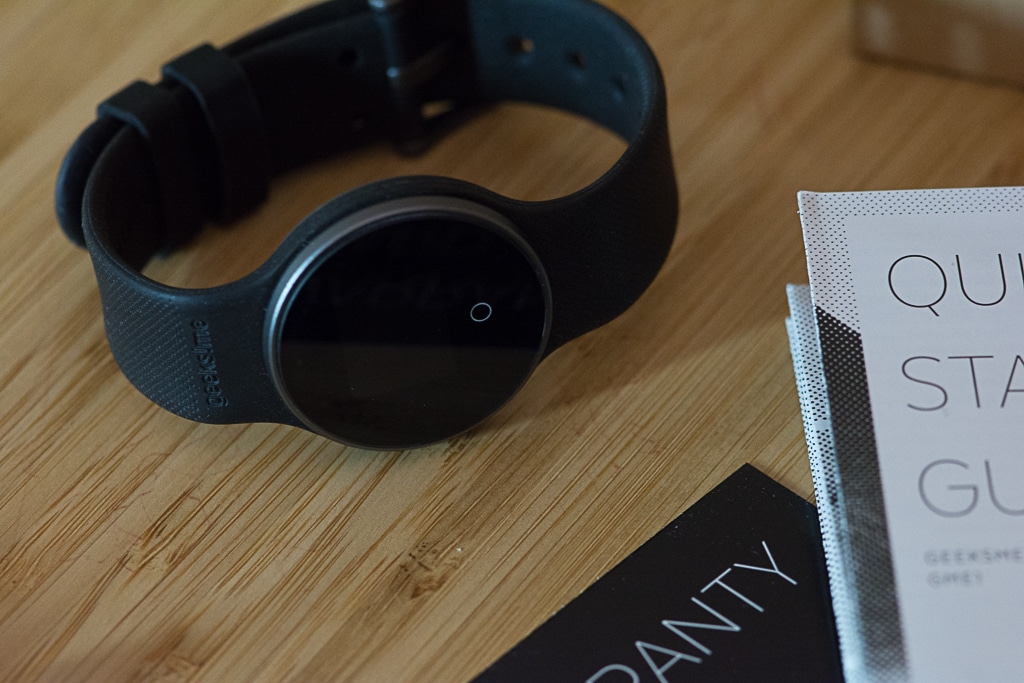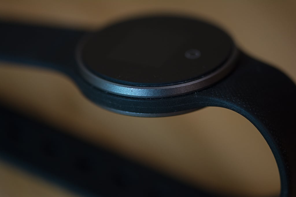 Le produit dispose d’un cadran de 32mm de diamètre intégrant un petit écran monochrome utilisant la technologie OLED. Sur le cadran nous avons 12 diodes blanches qui ont pris la place des habituels numéros d’une montre à aiguilles, elles permettent d’indiquer de façon originale et rapide le progrès effectué en fonction du but défini à l’aide d’une simple pression sur le petit cercle blanc du cadran cachant un bouton tactile.