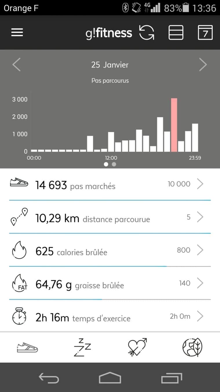 « g!fitness mesure l’activité sportive, pas, distance parcourue, calories et graisses brûlées, temps d’exercice, buts atteints et progrès