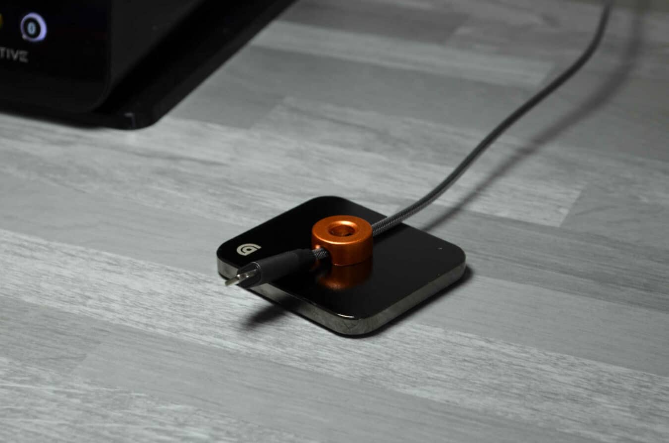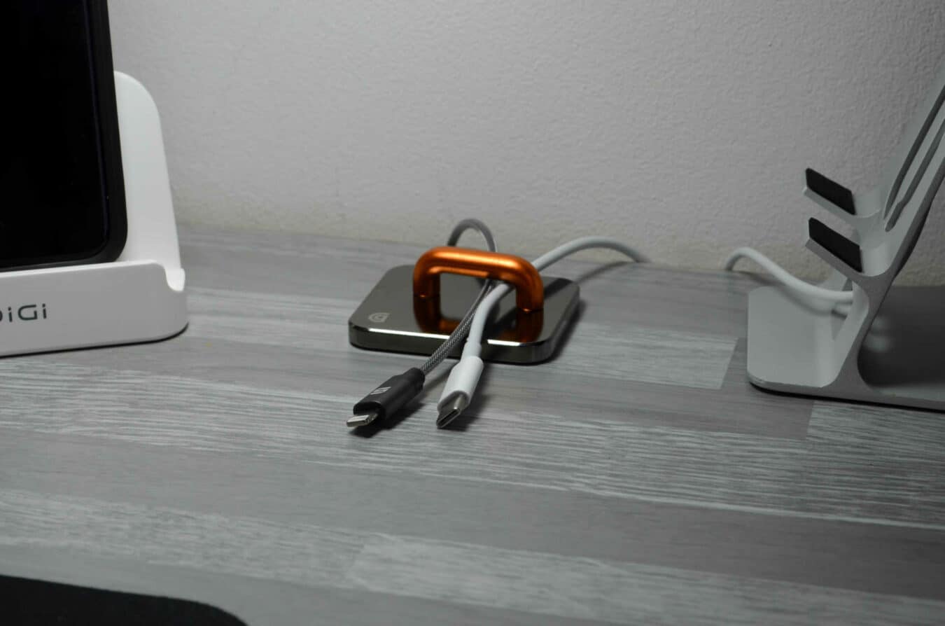 Comment composer son guide ? C’est très simple, il suffit de prendre une plaque, qui sont toutes les trois de la même dimension et d’y apposer l’adaptateur de son choix. Les plaques ne sont pas très grandes (5,5cm/5cm/0,5cm). Elles trouveront facilement une place sur le bureau, qu’il soit en bois, en verre ou en acier. Enfin, pour l’acier, il ne faut pas s’inquiéter pour l’aimant, une protection en silicone est fixée sous la plaque afin de protéger la surface et d’avoir un aspect antidérapant, même s’il arrive que ce guide bouge lorsque l’on veut prendre en main le dit-câble.